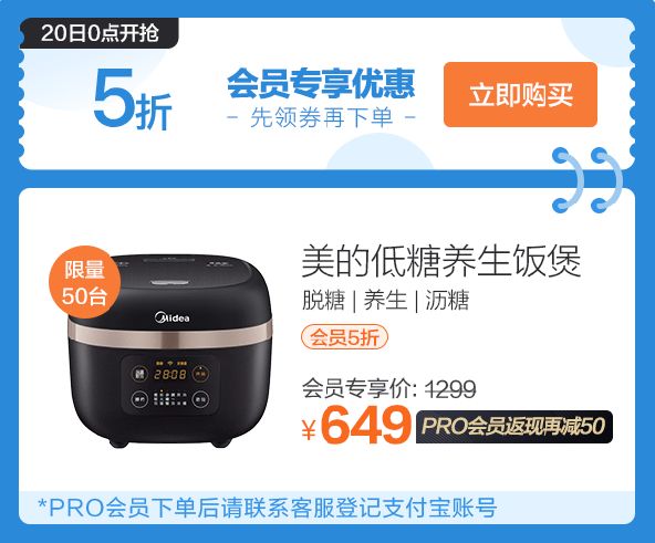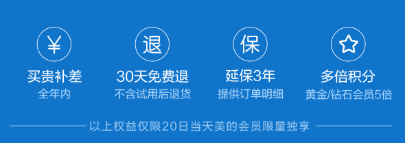 会员20日下单以上商品(低糖煲/破壁机)还额外享受全年买贵补差、30天免费退货、延保3年、订单多倍积分的会员特权!