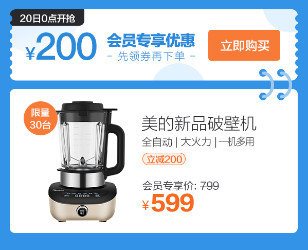 仅限3月20日当天下单的美的会员限量独享哦!全天都可200元优惠券,记得一定先领券再下单!