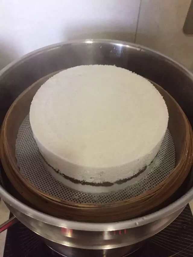 第4步,把笼屉放入已经水开的蒸锅里,大火蒸5分钟后,取出慕斯圈,再继续蒸15分钟,关火后焖5分钟,稍稍不烫即可围上慕斯围边(避免在空气中暴露久了会变硬)。