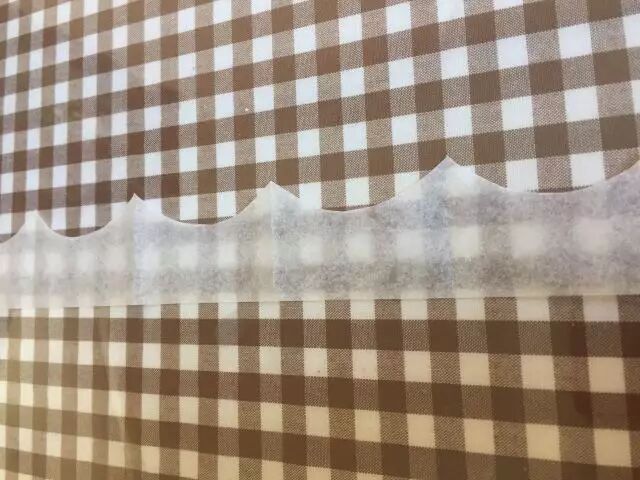 第1步,将油纸按照慕斯圈的长度剪一条围边,再把围边按照慕斯圈的高度剪一个上下起伏规则一样的山形围边