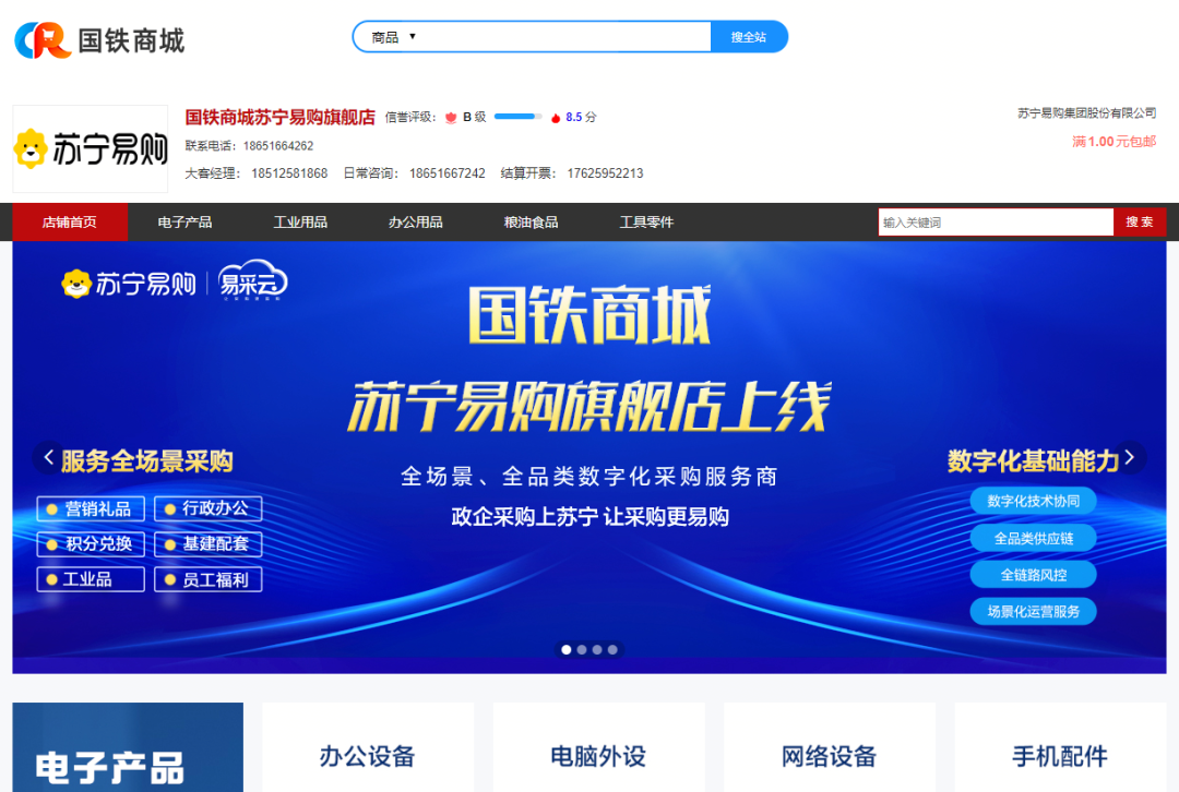 近日,“苏宁易购旗舰店” 正式上线国铁商城。苏宁易购将发挥自身系统平台及供应链能力,围绕客户需求,为国铁提供办公、电子、工业品、通用零件、通用工具、粮油食品、冷冻生鲜等采购服务。