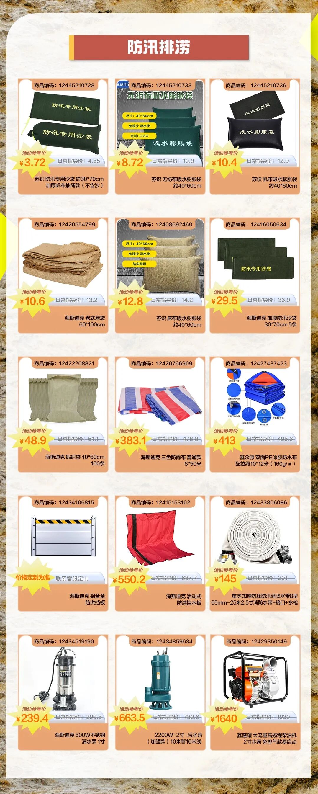 其中,某地铁公司一次性采购10万件防汛物资,包括防滑安全靴、雨衣等,24小时内配送至全市29个车辆段;某省联通公司一次性采购数万件防水沙袋、挡水板、应急照明设备等防汛应急物资,覆盖各地市分公司;某港口采购上万件防水帆布、沙袋、雨鞋等,保障港口的安全运营。
