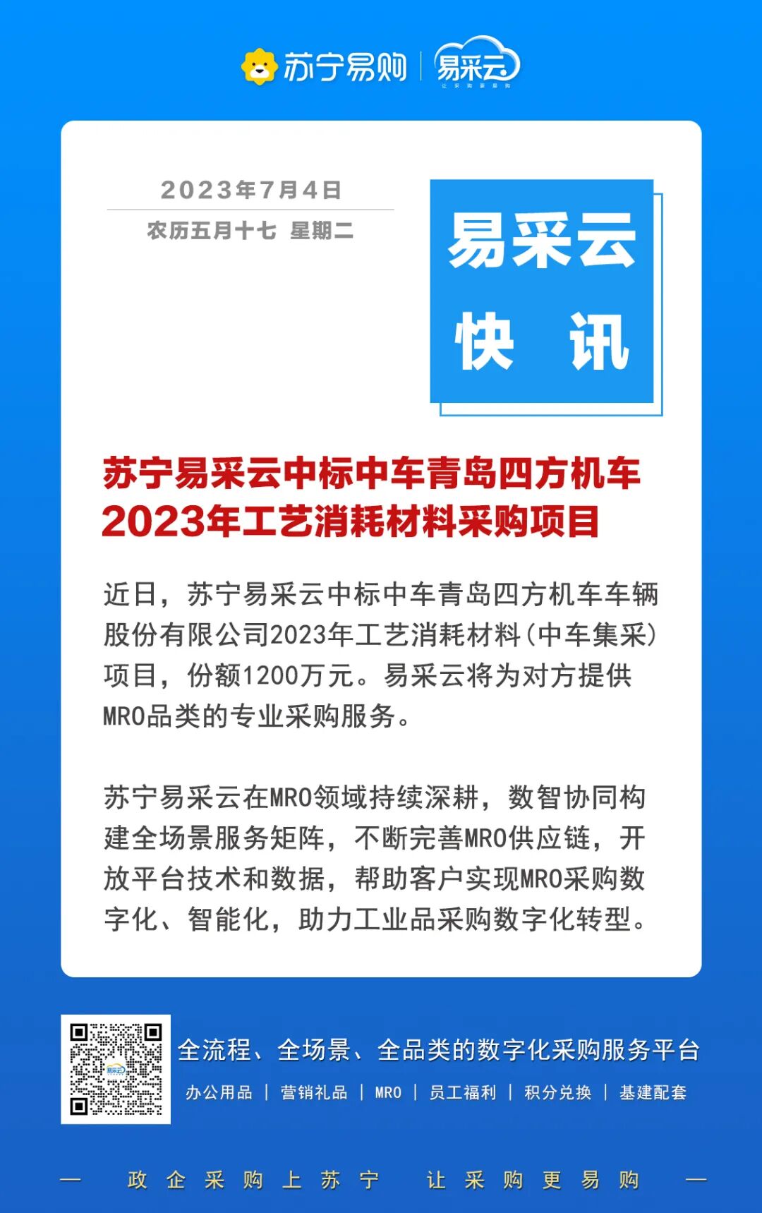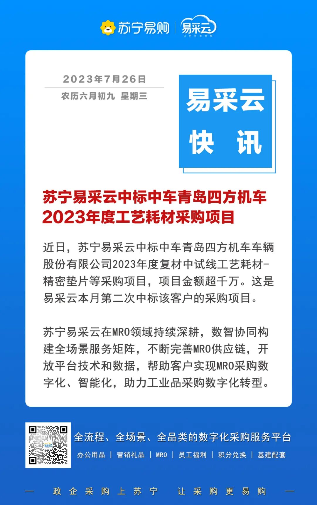 近日,苏宁易采云中标中车青岛四方机车车辆股份有限公司2023年度复材中试线工艺耗材-精密垫片等项采购项目,项目金额超千万元。易采云将依托自营供应链优势,为对方提供MRO品类的采购服务。