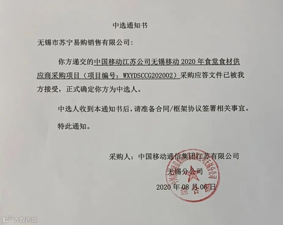 近日,苏宁大客户中标中国移动无锡分公司2020年食堂食材供应商采购项目,采购项目金额约为五百万元。