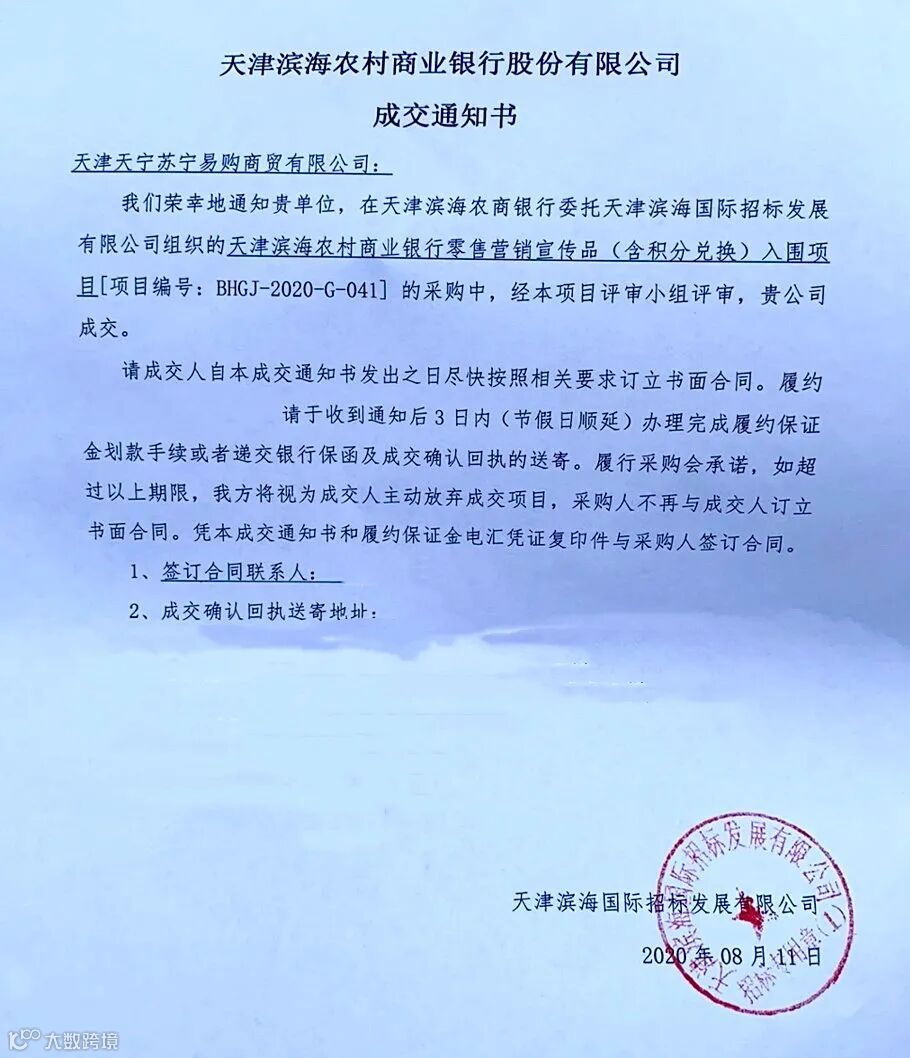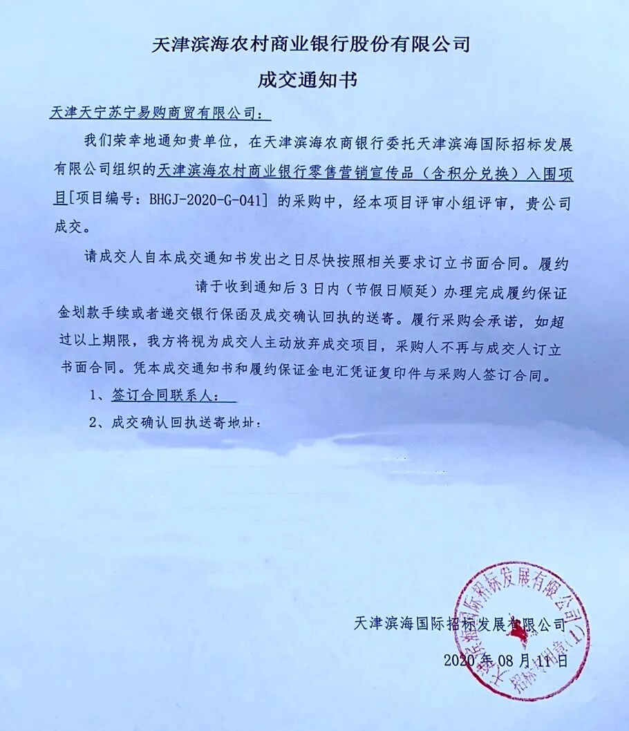 苏宁中标天津滨海农村商业银行全行营销礼品采购项目