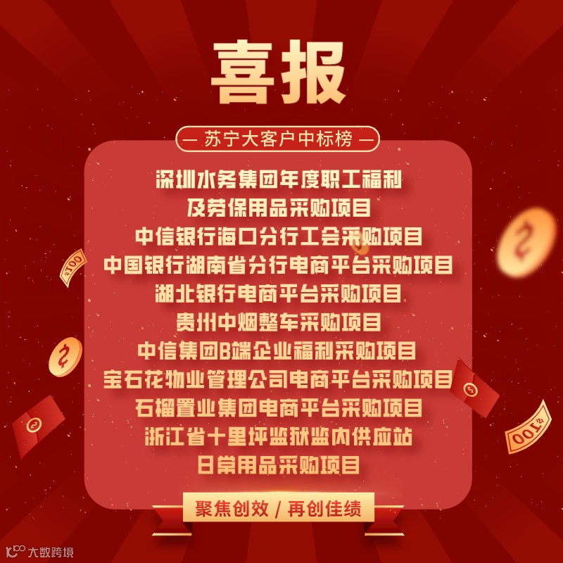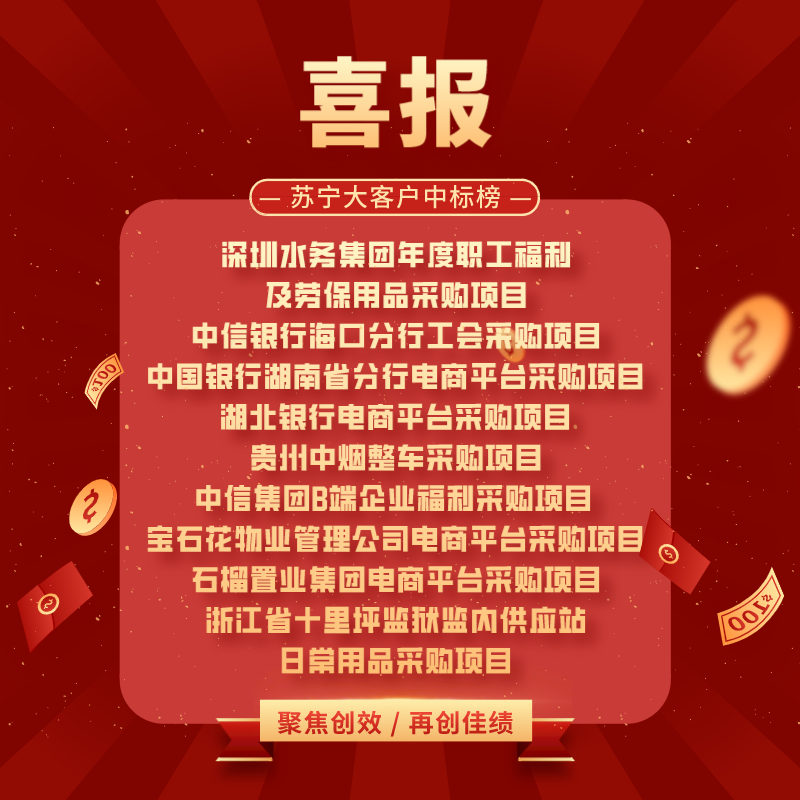 近日,苏宁大客户持续发力,中标多家政企单位电商化采购项目,项目包含:深圳水务集团年度职工福利及劳保用品采购项目、中信银行海口分行工会采购项目、中国银行湖南省分行电商平台采购项目、湖北银行电商平台采购项目、贵州中烟整车采购项目、中信集团B端企业福利采购项目、宝石花物业管理公司电商平台采购项目、石榴置业集团电商平台采购项目、浙江省十里坪监狱监内供应站日常用品采购项目等。