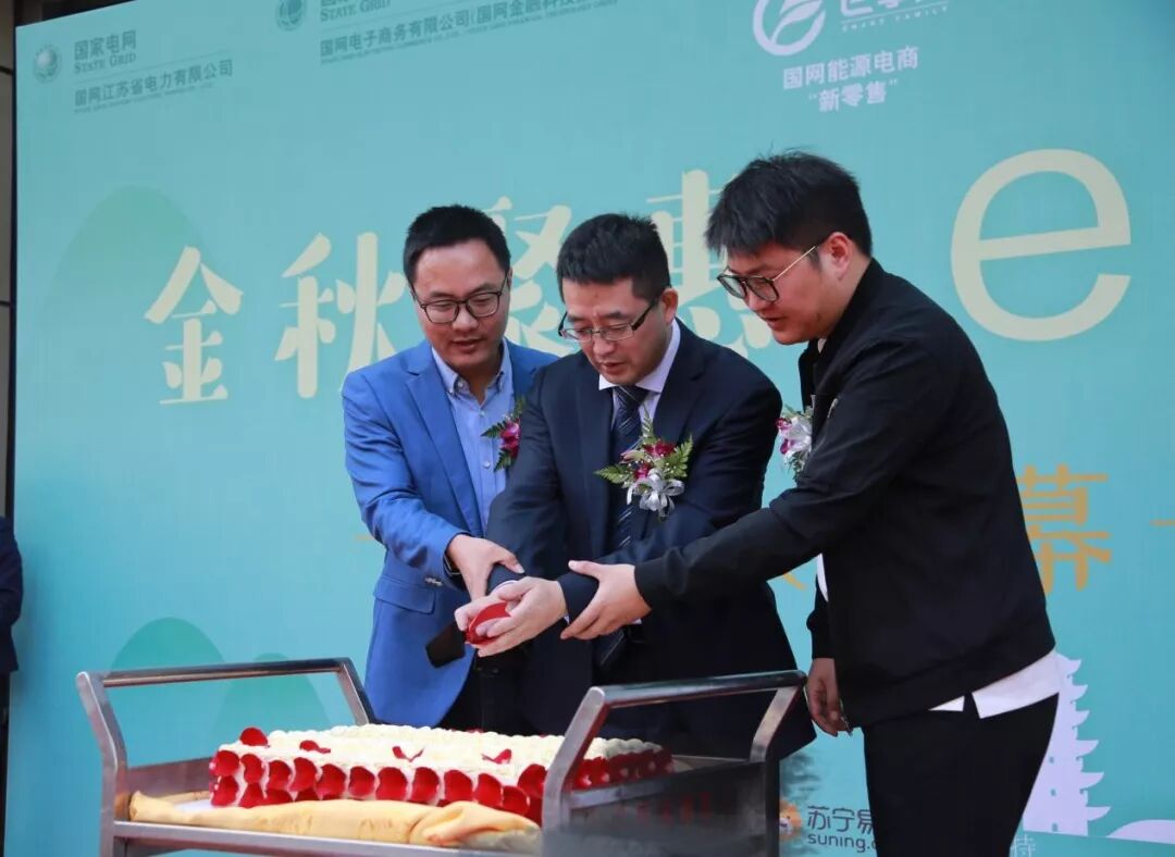 国家电网南京供电公司党委委员、副总经理张凌浩、国家电网电商公司新零售事业部总监洪福斌与苏宁易购B2B公司能源中心总经理李吉一起,共同切开了标志着国网“新零售”的蛋糕。