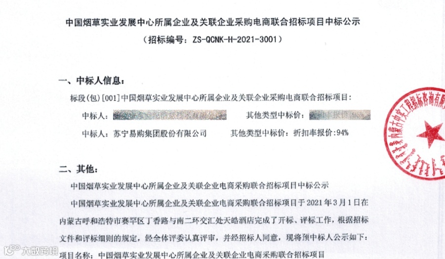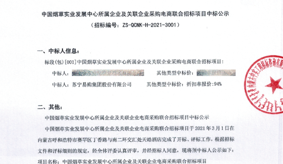 3月3日,苏宁中标中国烟草实业发展中心所属企业及关联企业电商采购联合招标项目,本次项目采购需求有俩大特点,其一种类繁多且均需要电商自营商品,商品大到家具电器、小至生活用品。其二覆盖范围广,中国烟草实业发展中心所属企业分布在呼和浩特、哈尔滨、深圳等9个大区。对入围此项目电商的售后服务能力、货物储存种类和物流供货能力提出了高要求。