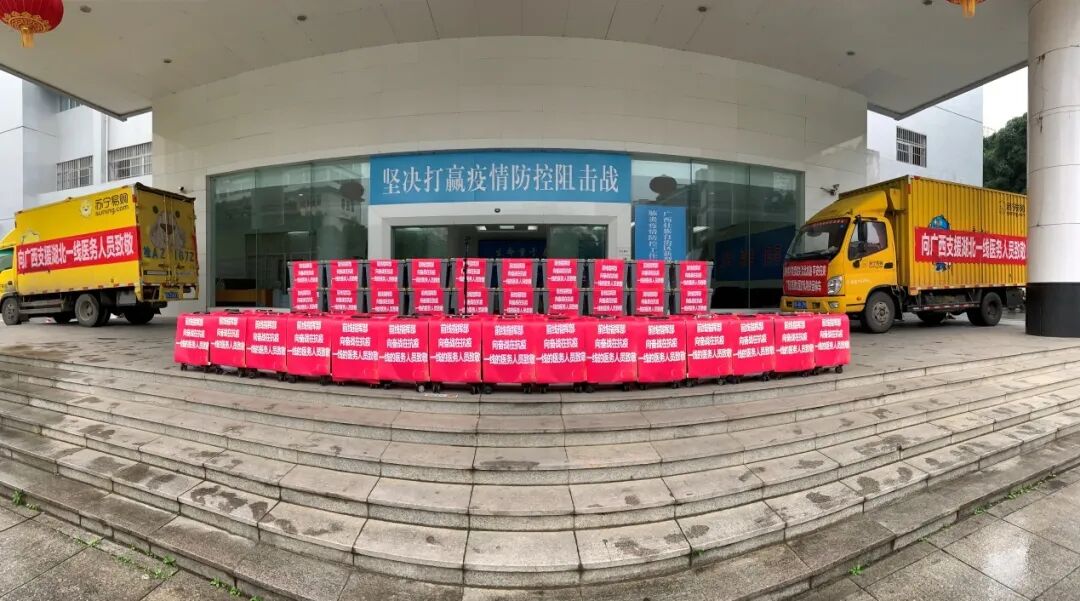 3月2日下午,随着广西自治区政府副秘书长许瑾的一声发车令下,两辆身披“向广西支援湖北一线医务人员致敬”横幅的苏宁物流车承载着对广西援鄂医疗队的祝福,正式发车开往湖北。