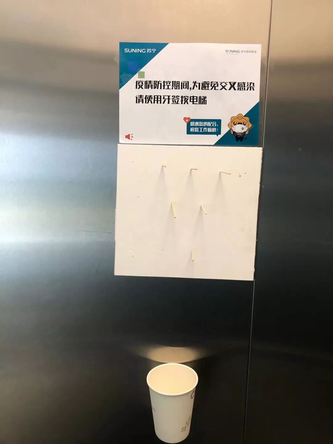 苏宁为了避免皮肤接触电梯导致感染,因此在电梯按键旁设置了牙签盒,便于上下楼按电梯使用。(小采觉得这种方式比纸巾更方便环保)