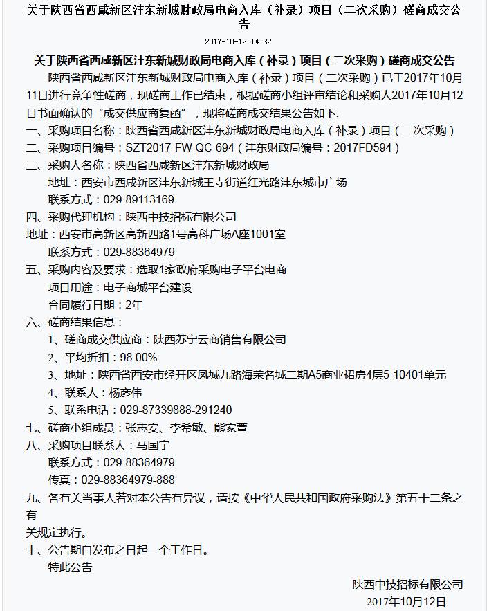 10月12日,陕西省西咸新区沣东新城财政局电商入库(补录)项目结果公示,苏宁成为其电商采购平台唯一入围的供应商。该项目是陕西省政府采购的试点项目,苏宁成功入围,是陕西省政府对苏宁政采服务的肯定。