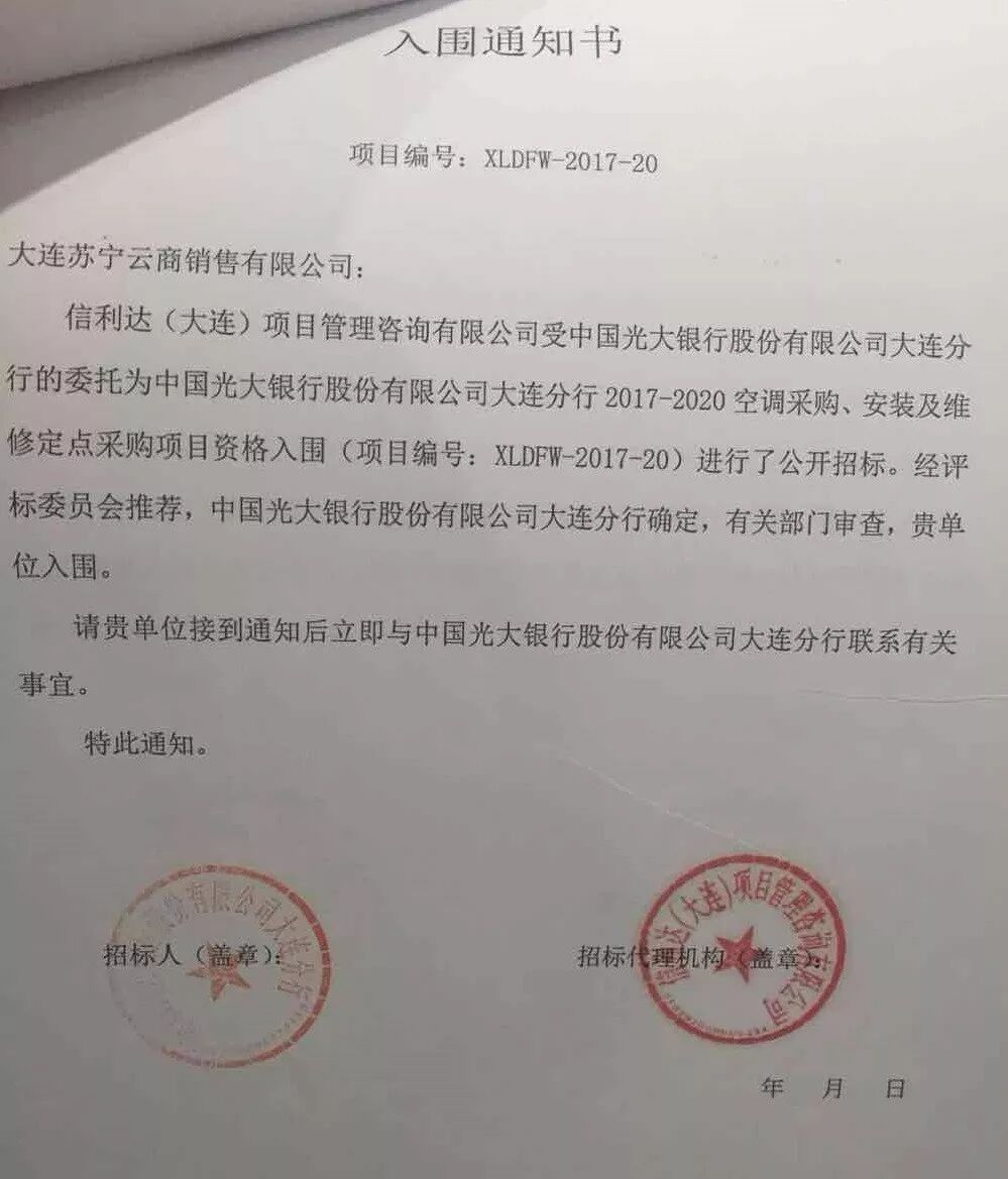 10月13日,苏宁中标中国光大银行股份有限公司大连分行2017-2020空调采购、安装及维修定点采购项目。苏宁将为中国光大银行股份有限公司大连分行提供高品质的产品、本地化的服务。
