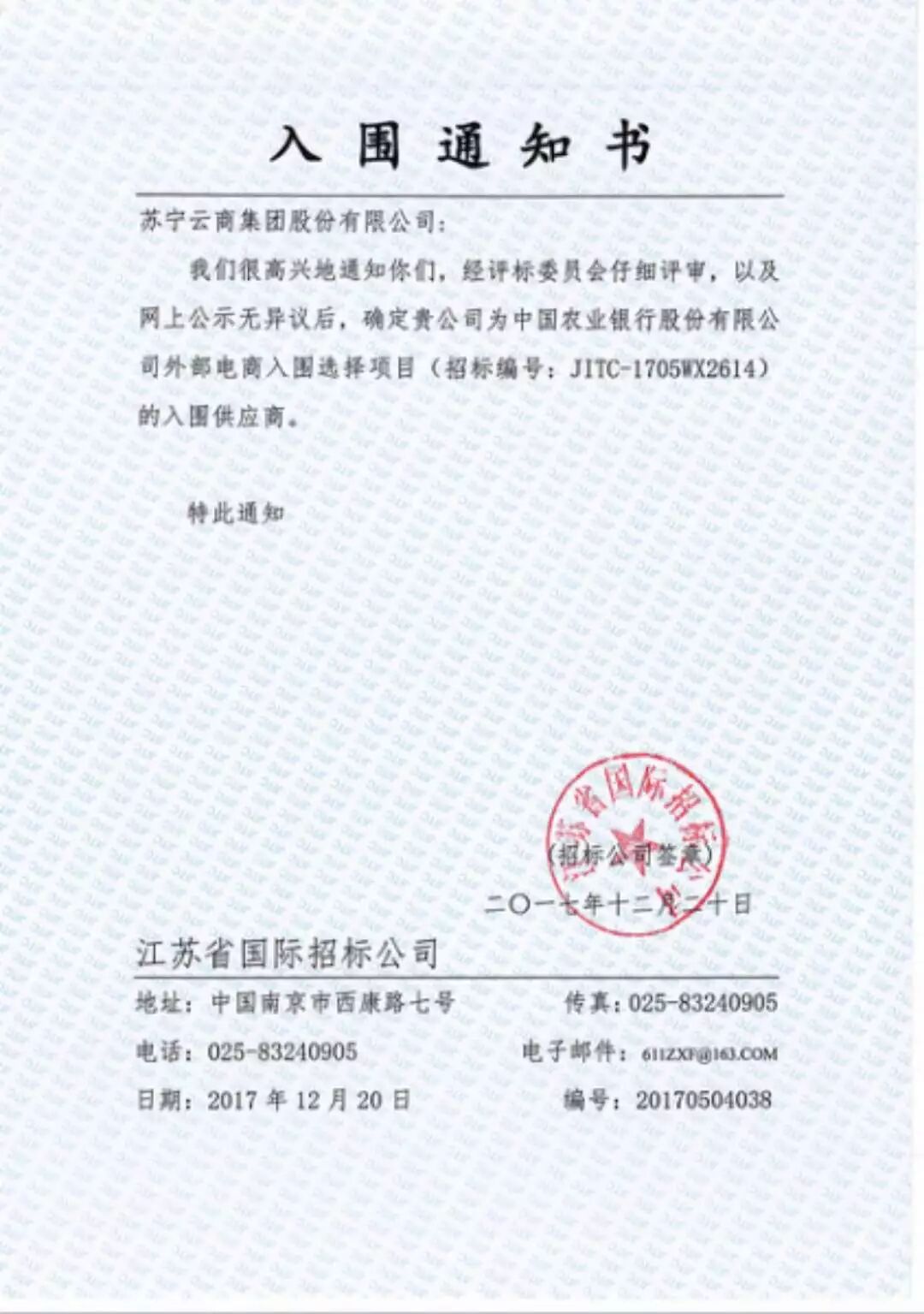 近日,中国农业银行全国性外部电商项目招标结果公布,苏宁成功入围,作为五大行第一个全国性电商化采购项目,其行业影响不言而喻。依托专业的金融行业解决方案,苏宁大客户将为中国农业银行总行和各地分行提供包括商用设备、办公耗材、营销礼品等项目的全流程采购服务。此次携手农行,也是继独家中标农行安徽省分行、甘肃省分行后,苏宁大客户20天内中标的第三个农行电商化年度采购项目,苏宁大客户的综合实力不言而喻。