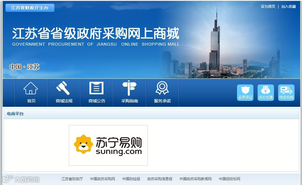 2015年,经过前期大量的调研和准备,江苏省政府政府采购商城上线运行,苏宁作为首批电商入驻,为全省采购单位提供计算机设备及软件、办公设备、图书档案设备、电气设备、办公消耗用品等13大类160个品目商品的采购支持,所有商品均是财政部、国家发改委公布的节能产品政府采购清单中的产品,并根据每半年发布的清单及时调整专用平台中的商品。