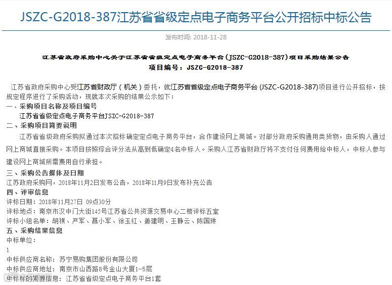 11月29日,江苏政府采购网公布了江苏省省级定点电子商务平台公开招标中标公告,苏宁易购以综合排名第一再度入围江苏省采电商平台。