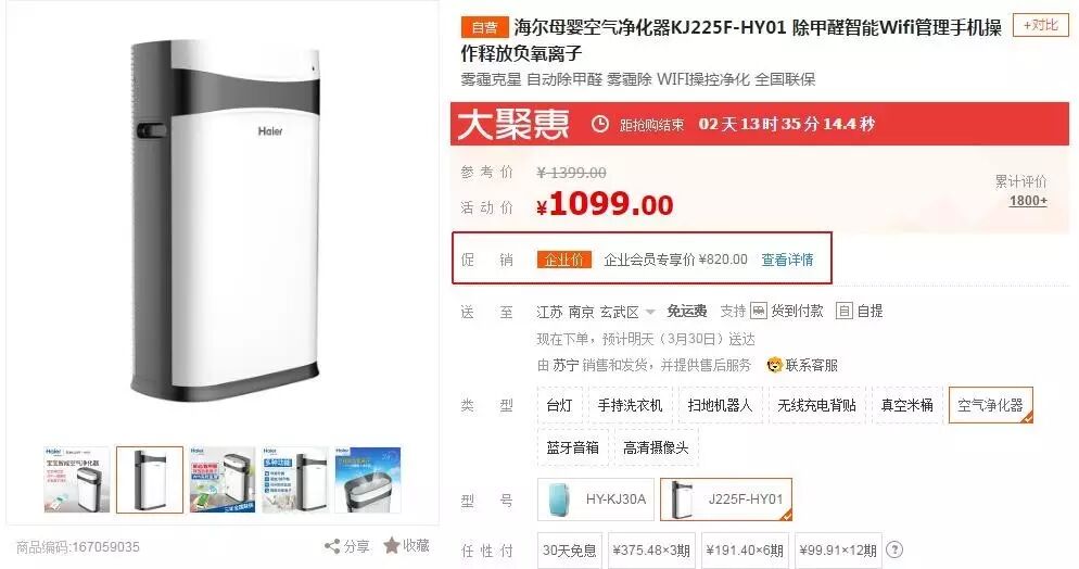 418企业采购活动期间,将精选多款企业专享商品供企业会员采购,其中海尔空气净化器,苏宁大聚惠价格1099元,企业价更享受7.5折,即 820元。春季空气中的成分更复杂,对人们造成的影响或伤害更大,容易引发疾病,更需要空气净化器。