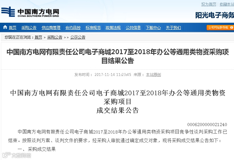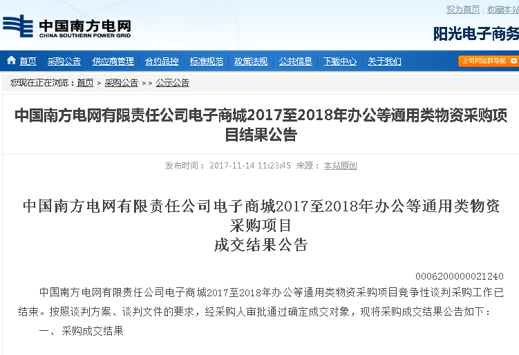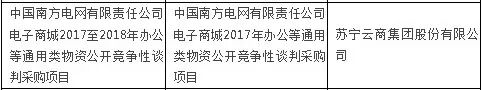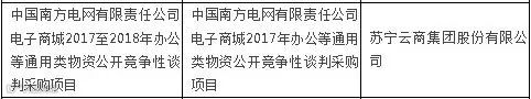 11月14日,中国南方电网电子商城2017至2018年办公等通用类物资采购项目结果公布,苏宁云商凭借自身百万量级产品、属地化服务优势、O2O采销平台等服务特色成功中标。这是继今年9月苏宁中标国网物资采购电商化项目、7月中标中电投采购电商化项目后,在电力行业的又一突破。