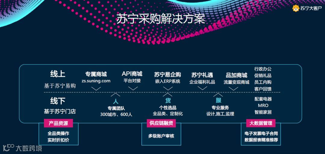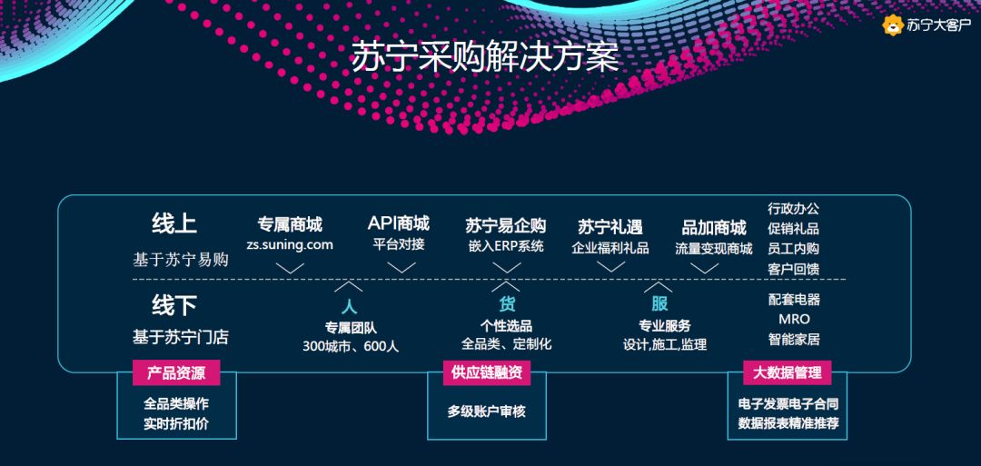 据介绍,苏宁大客户通过线上基于苏宁易购,线下基于苏宁门店的O2O双线融合模式,为能源企业提供了专属商城、API商城、苏宁易企购,苏宁礼遇,品家商城等涵盖企业办公采购、员工福利、营销礼品等全场景的采购解决方案。