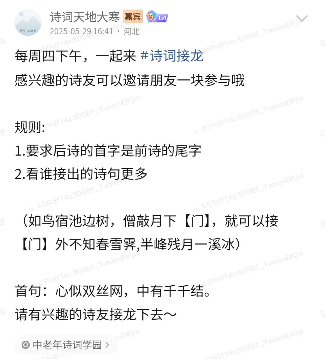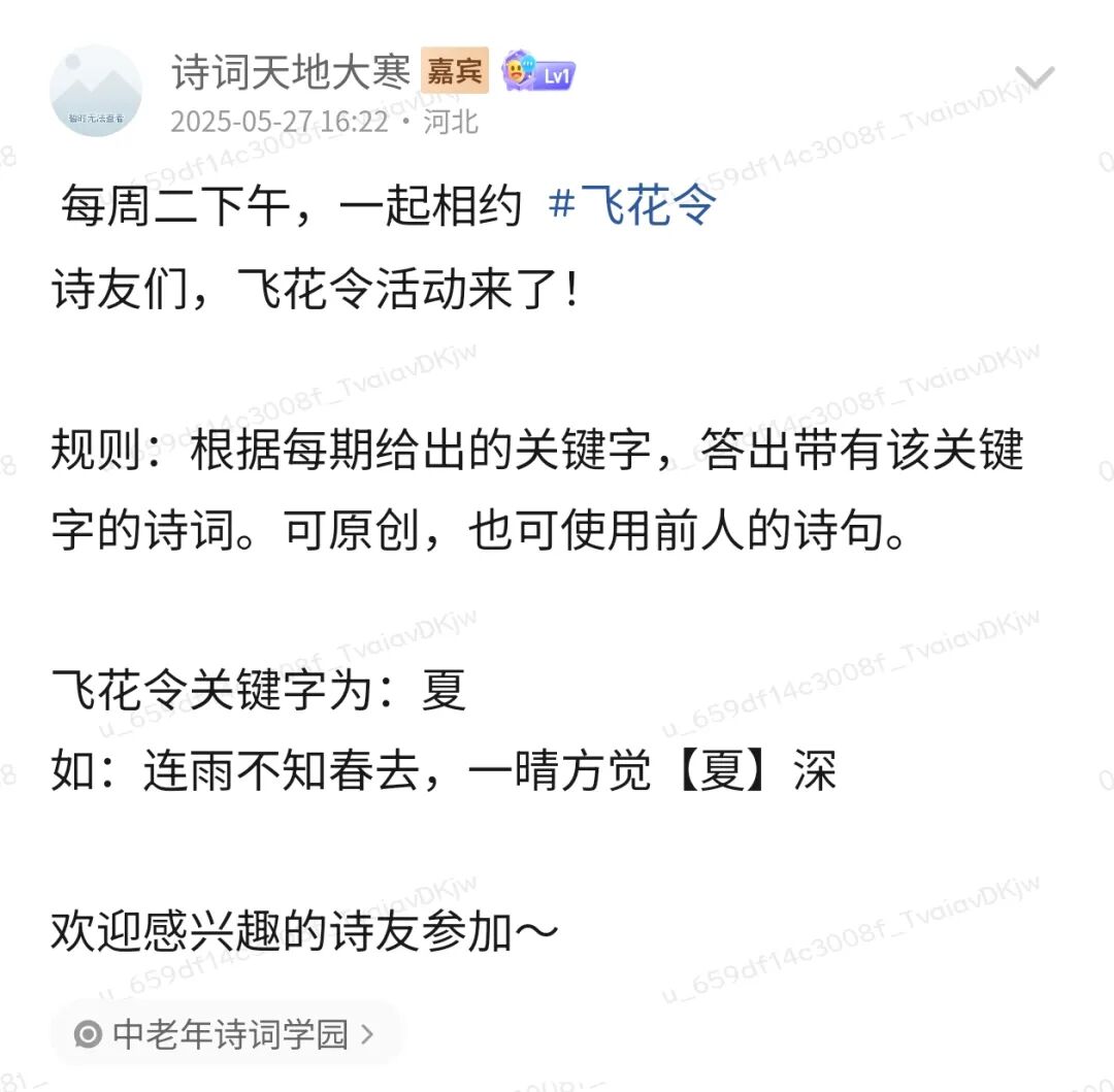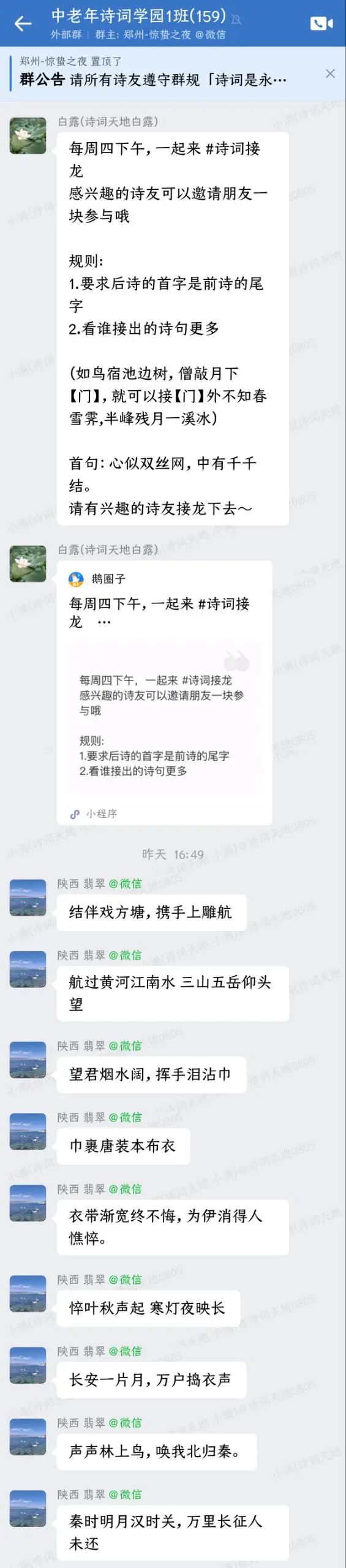 “诗词飞花令”,“诗词接龙”活动是诗词天地会员群内特有活动,分别于周二,周四在会员诗友圈内举行。