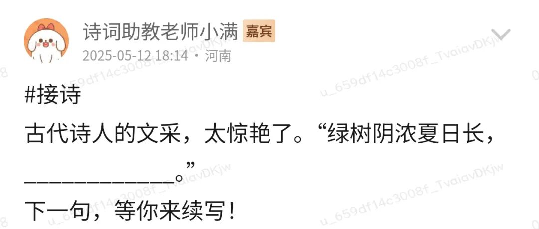 接诗为每周一活动,诗词老师给出上句,诗友们接下句,无过多要求,接出即可。