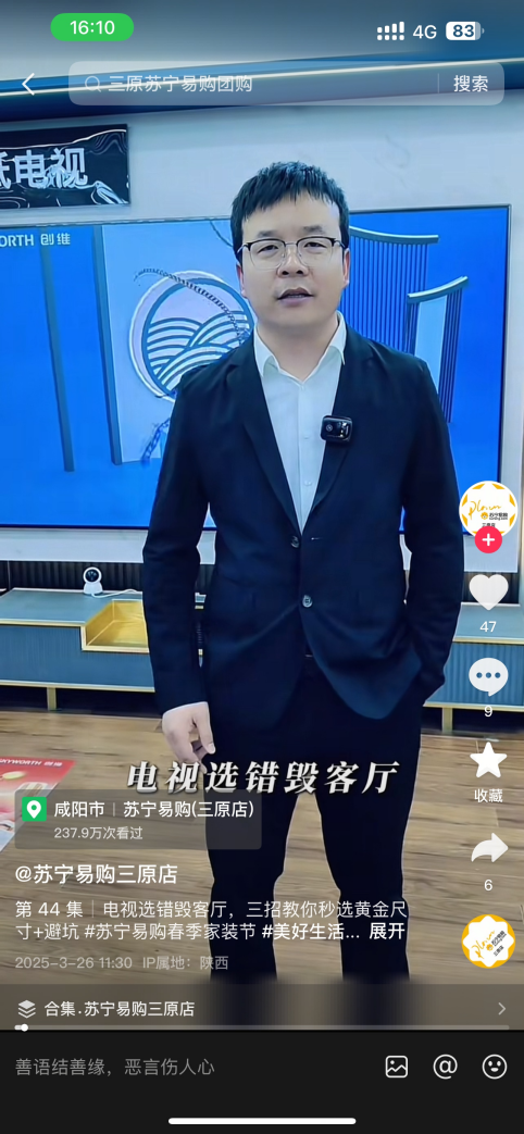 “电视选错毁客厅,3招教你避坑,秒选黄金尺寸。”在陕西省咸阳市三原县,张超身穿一身黑色西装,领口别着麦克风,单手插兜站在巨幕电视前侃侃而谈,讲解电视选购的避坑技巧。这是张超每日工作待办的第一项,给“苏宁易购三原店”的抖音账号录短视频。