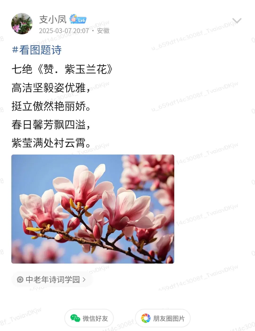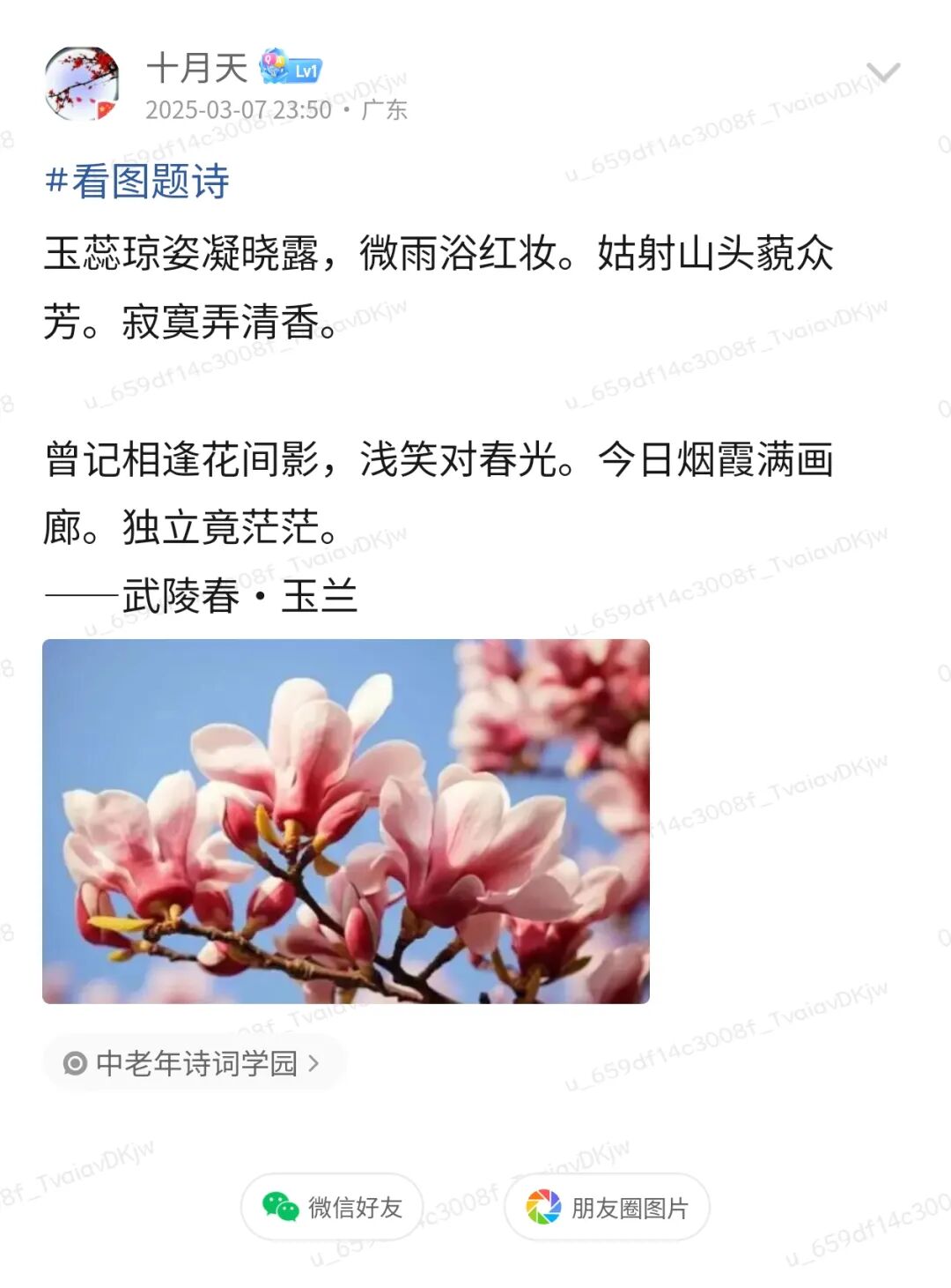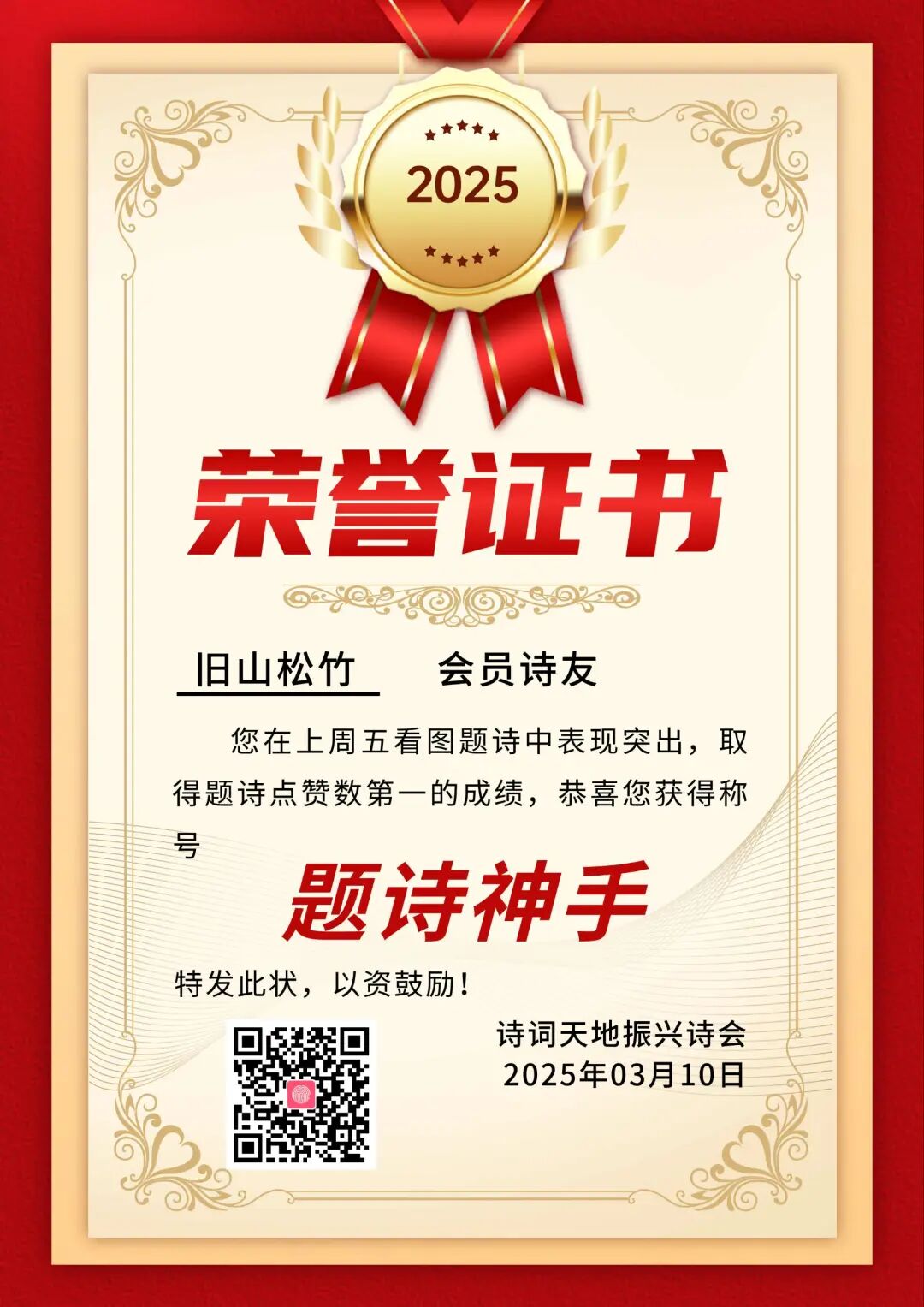 恭喜 旧山松竹 会员诗友,在上周五看图题诗取得点赞数第一的成绩,获得称号“题诗神手“。