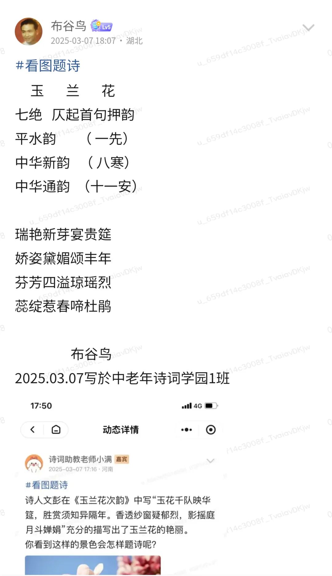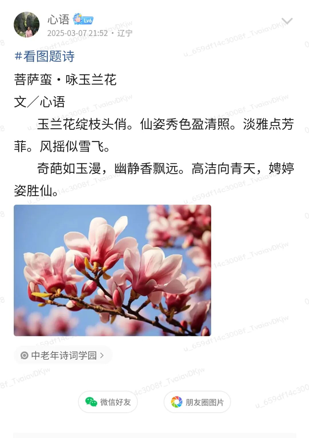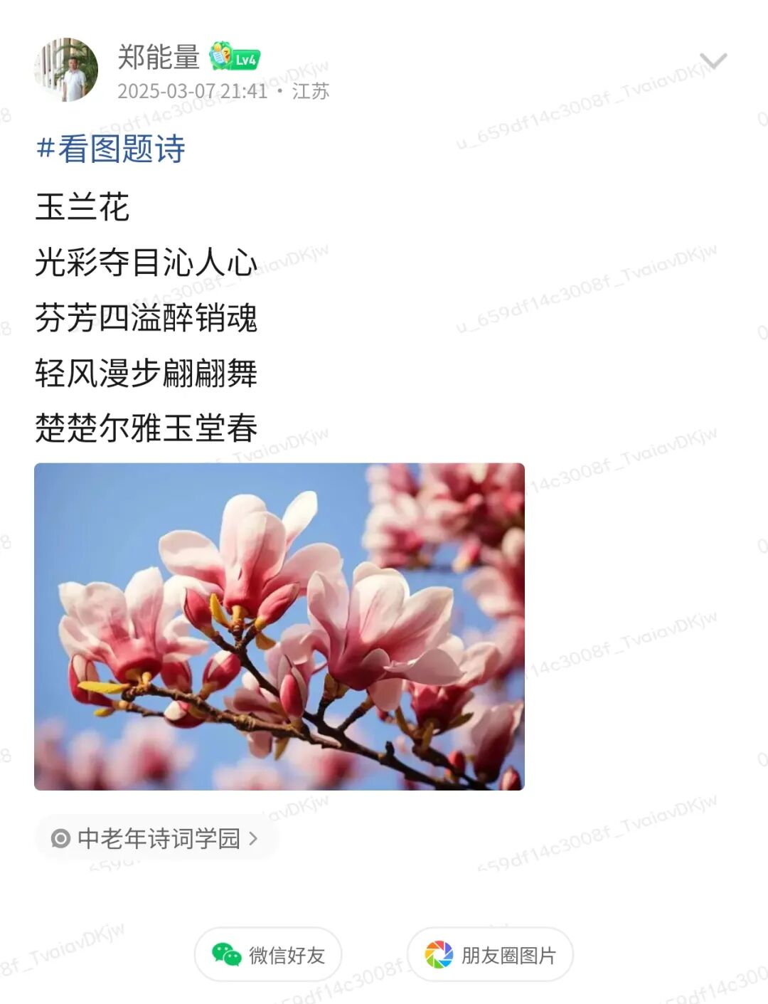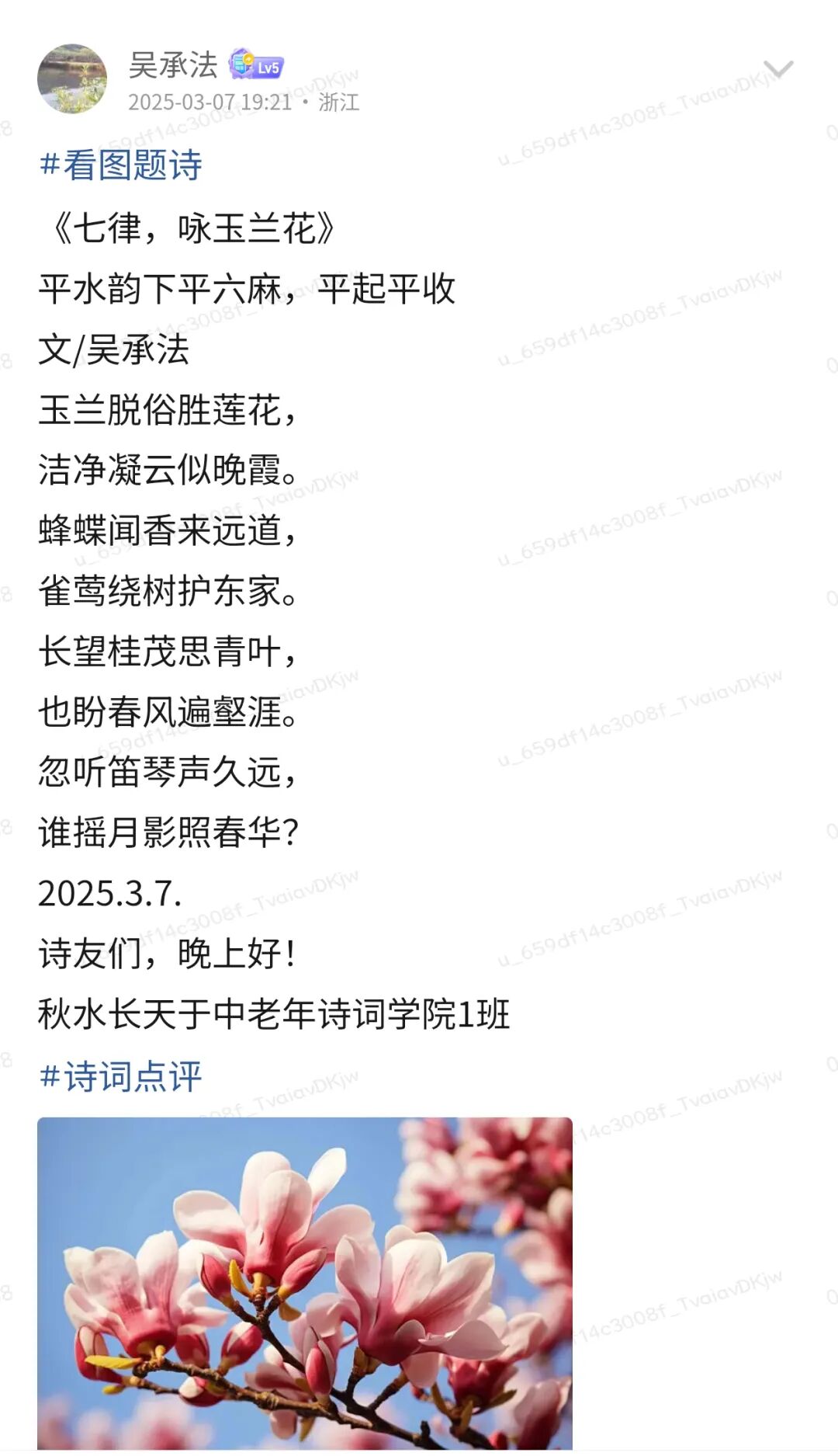 恭喜 旧山松竹 会员诗友,在上周五看图题诗取得点赞数第一的成绩,获得称号“题诗神手“。