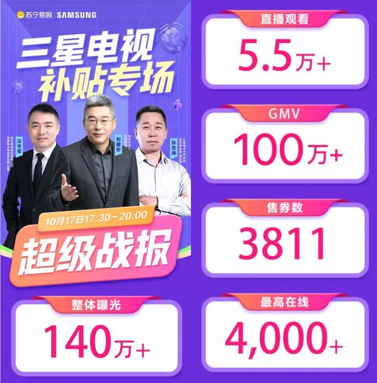 数据显示,本场直播超5.5万人在线观看,平均每分钟售券28单,整场售券金额超100万。直播现场,名嘴刘建宏化身“彩电体验官”,与苏宁易购消费电子商品事业部总裁汪令军、三星电子大中华区视听事业部副总裁孙志涛,边体验、边砍价,为直播间的消费者带来双11彩电惊喜价。500抵5500元85吋电视团购券、200抵1200元75吋电视团购券、100抵200元三星品牌通用券……团购券一经上线便秒空,直播间网友纷纷隔空喊话补货。