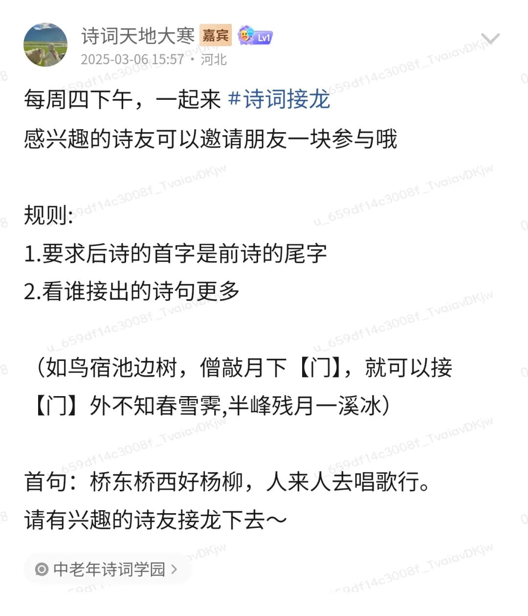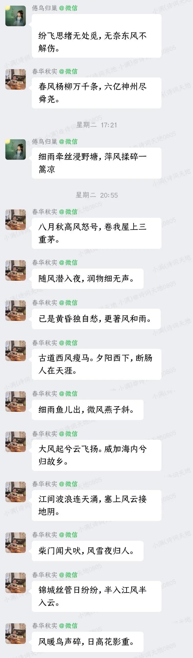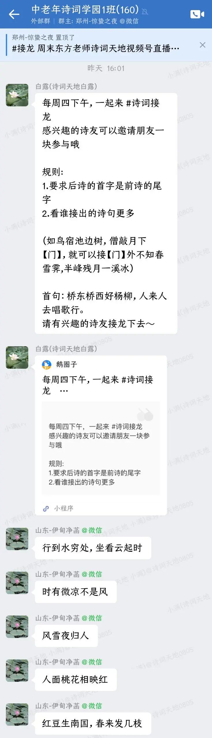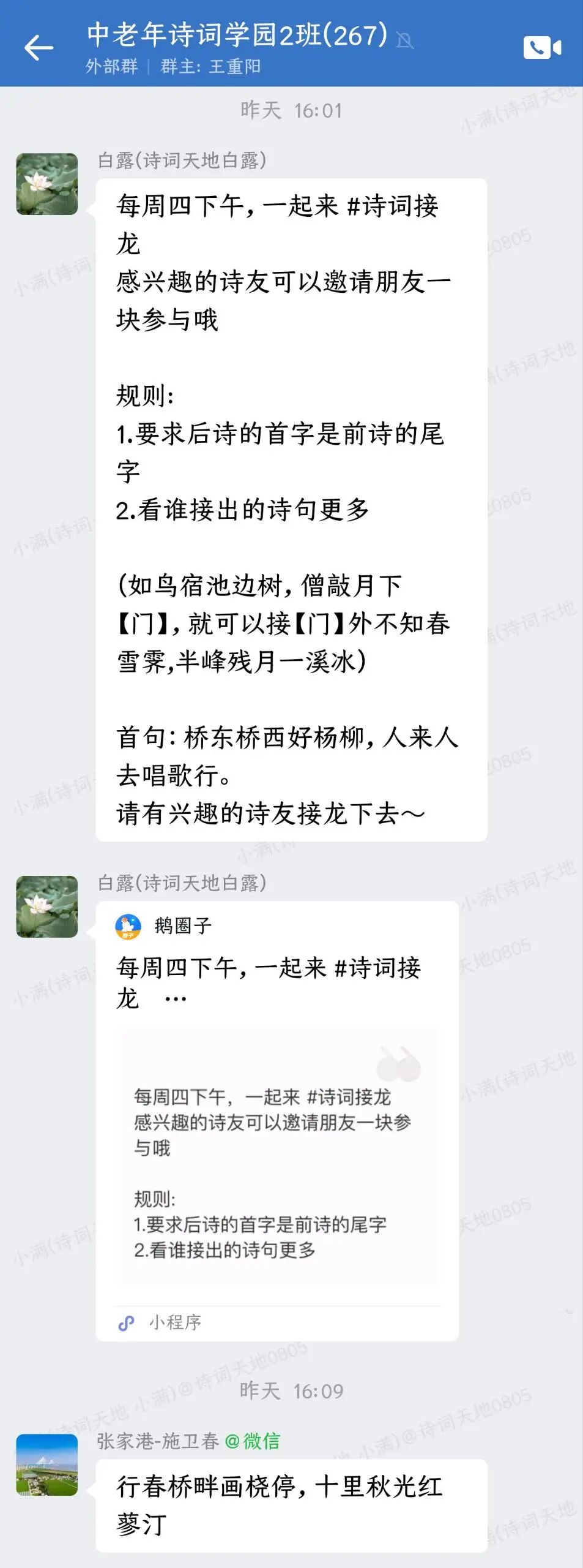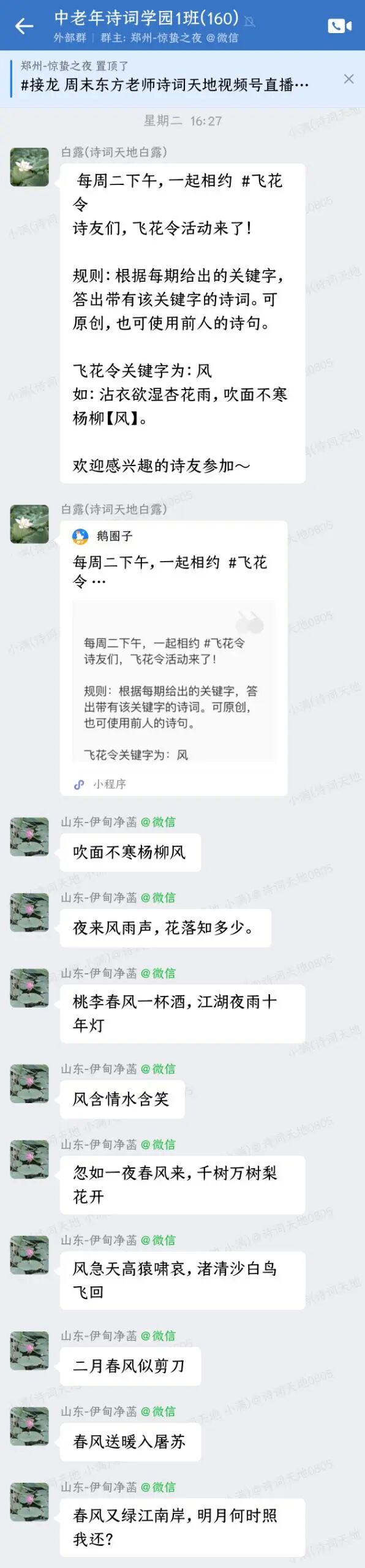 “诗词飞花令”,“诗词接龙”活动是诗词天地会员群内特有活动,分别于周二,周四在会员诗友圈内举行。