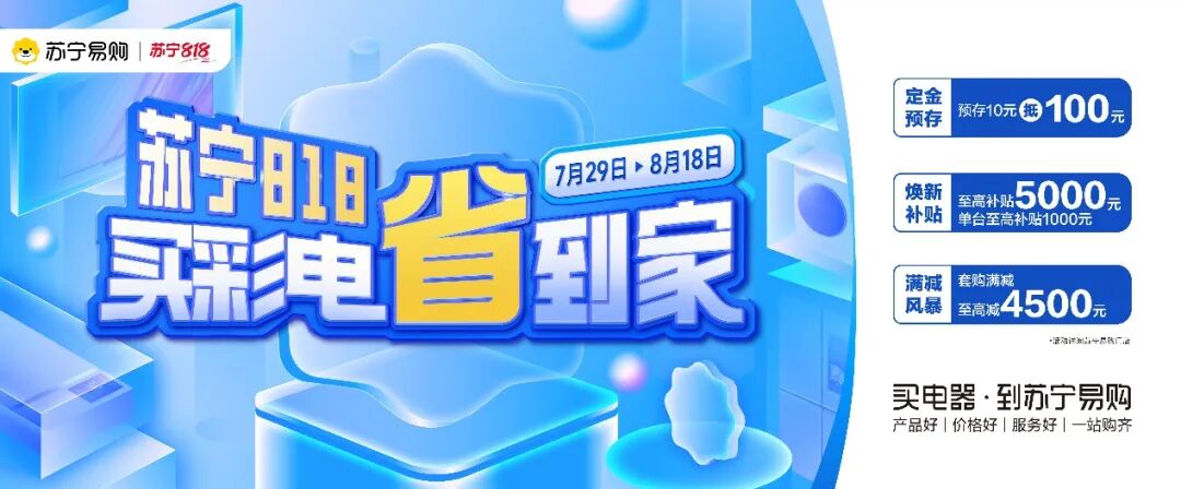 积极响应号召,7月26日苏宁易购启动818大促,全力支持家电以旧换新,推动绿色、智能、健康家电普及。据悉,苏宁易购联合海信、创维、TCL、三星、康佳、长虹等品牌,持续加码换新补贴,消费者参与电视以旧换新,至高可享5000元换新补贴、套购至高减免4500元。此外,用户购买98吋及以上电视可享免费设计、免费测量、免费安装等服务。苏宁易购整合场景、服务、供应链优势,助力用户“买彩电省到家”。
