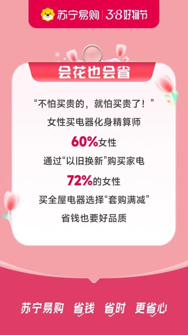 苏宁易购大数据显示,六成女性通过“以旧换新”节省开支。此外,72%的女性购买全屋电器时选择“套购满减”活动来省钱,主打一个“该省省,该花花”。