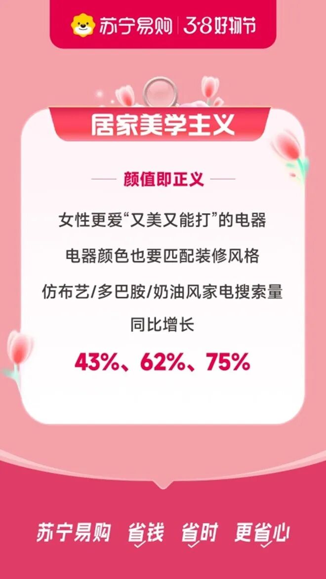 此外,女性消费者对于家电色彩的选择也极为用心,追求家电外观颜色与装修风格的和谐美,38好物节期间,家电加仿布艺、多巴胺、奶油风等关键词,在苏宁易购平台上搜索量同比分别增长43%、62%、75%。