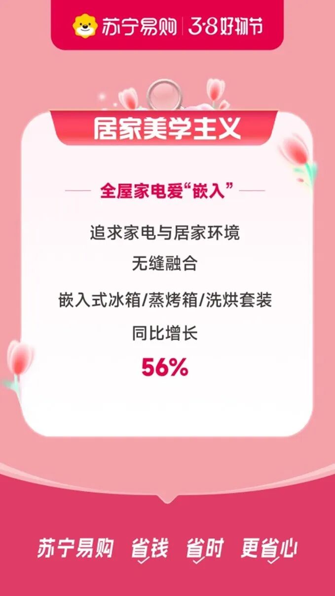 在打造理想化的居住空间时,“居家美学主义”已经成为新时代女性消费者的一种审美理念。她们善于合理利用空间,将大型家电采用“嵌入式”无缝融入室内,提升居室的视觉效果和整体美感。苏宁易购38好物节期间,女性买家购买嵌入式冰箱/蒸烤箱/洗烘套装的数量同比增长56%。