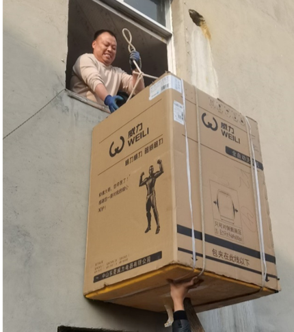 坑洼的绕山小道、室内狭窄的楼梯转角、木制结构的脆弱易裂,这些侗寨特有的地形和建筑结构,都为蔡富荣的配送与安装工作带来了巨大的挑战。蔡富荣带着专业安装师傅到客户家里,会确保家电能够安全、高效地送达客户手中,并在不损害房屋结构的前提下完成安装任务。