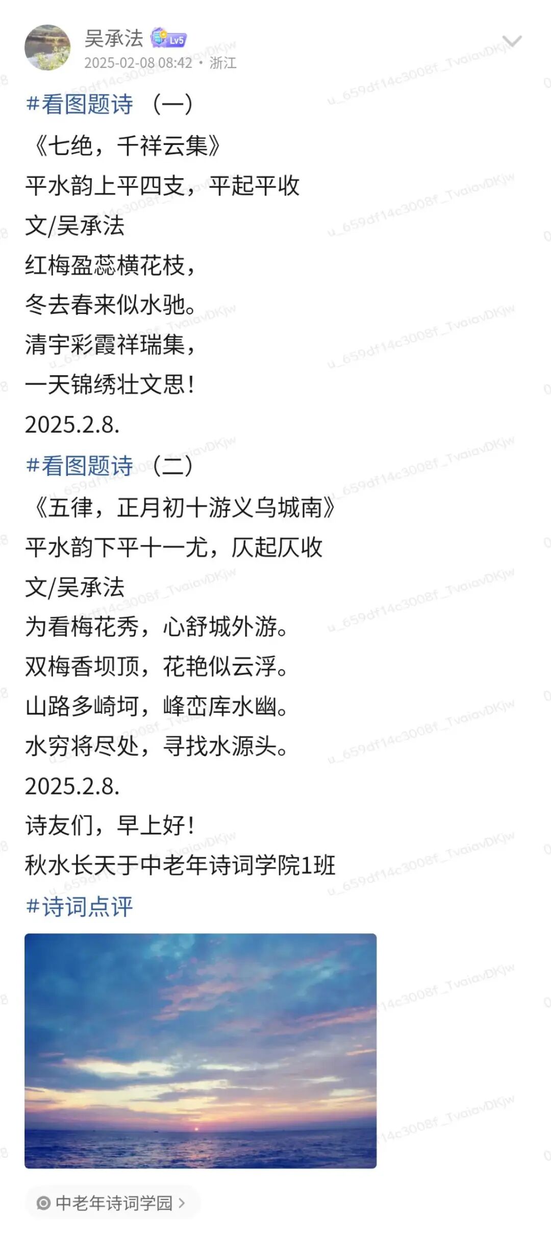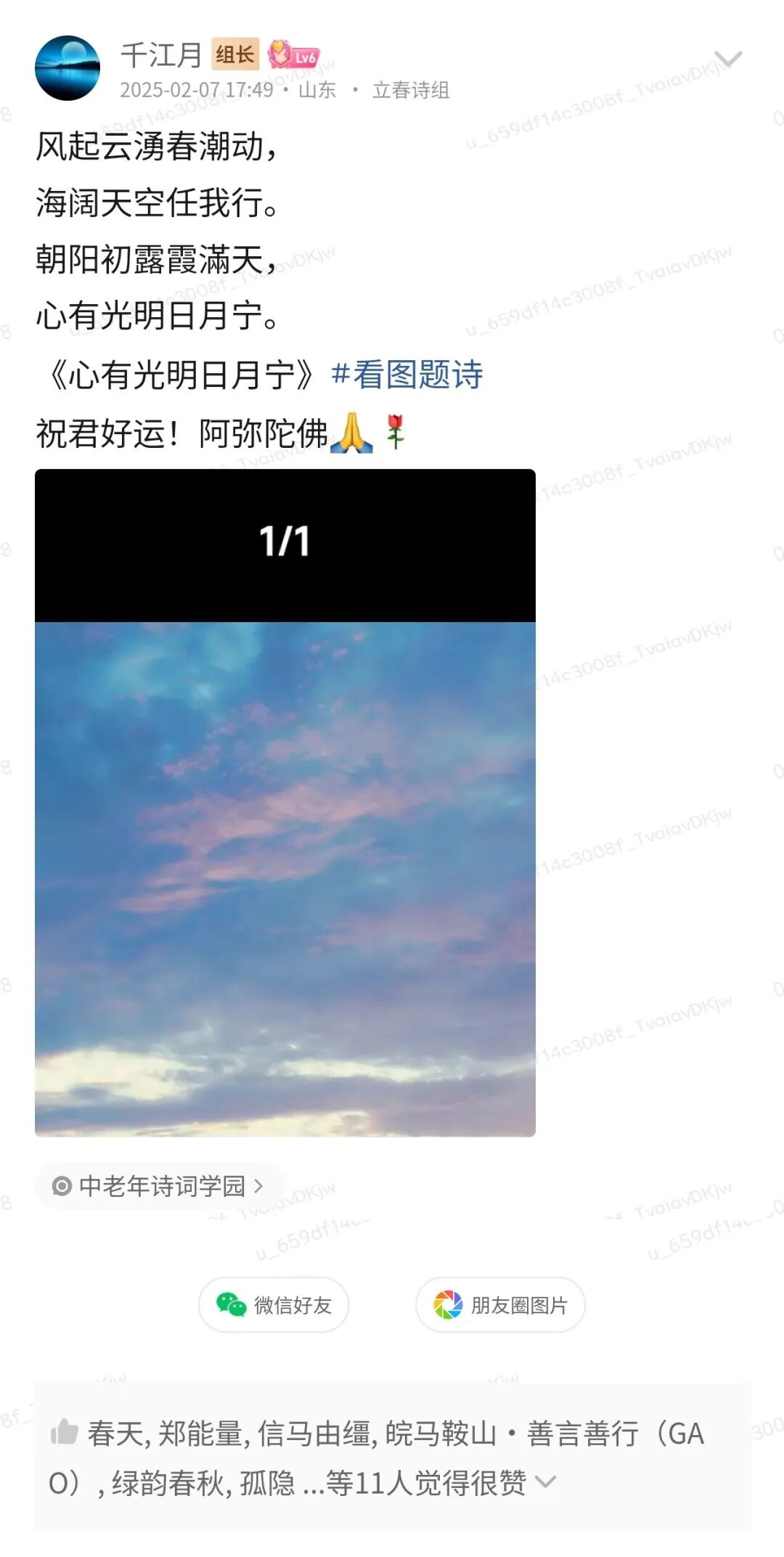 恭喜 信马由缰 会员诗友,在上周五看图题诗取得点赞数第一的成绩,获得称号“题诗神手“。