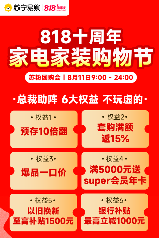 苏宁易购将以818十周年家电家装购物节为契机,加速零售服务商升级,聚焦以专供产品为核心优势的供应链能力、以本地化零售为核心优势的运营服务能力,为用户提供更好的场景、产品和服务体验。