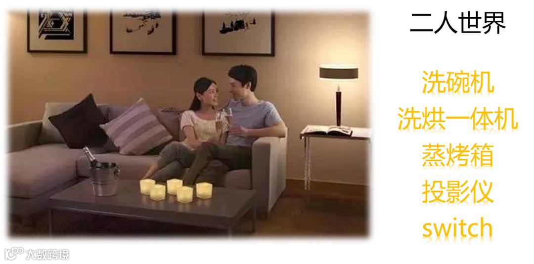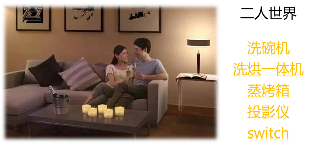 年轻一代的新婚夫妇都希望成立独立家庭而不受父母影响,这也意味着日常生活起居都需要自行打理,而搬砖小夫妻下了班都只想宅家躺着。所以,不少品牌和零售商紧盯新婚夫妇的消费需求,开发出实用实惠的洗碗机、省时高效的洗烘一体机、打造家庭影院的投影仪、结伴玩耍的switch游戏机……
