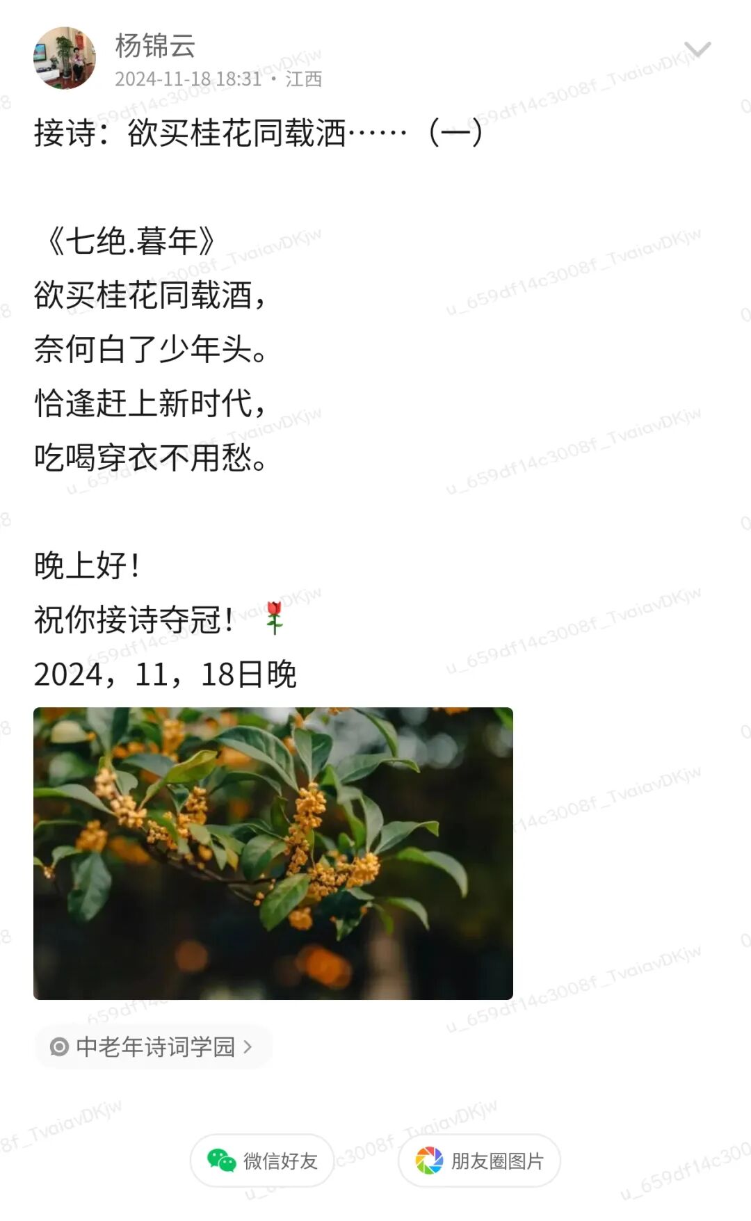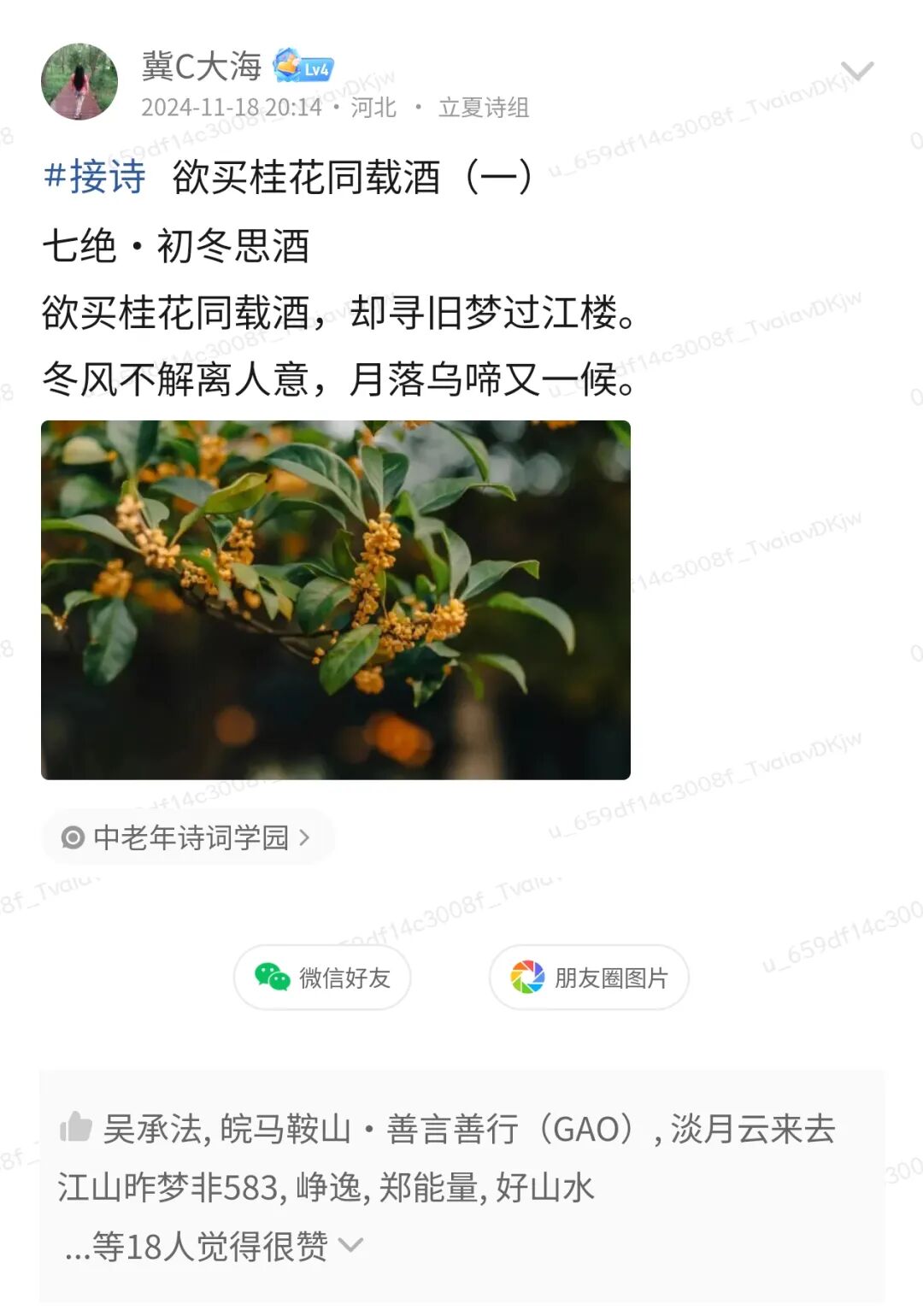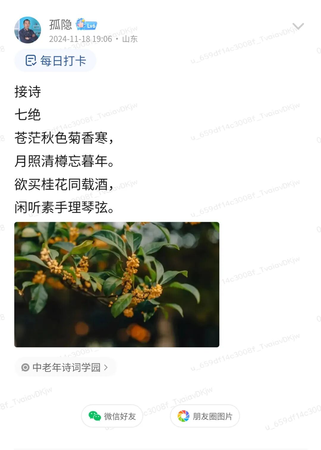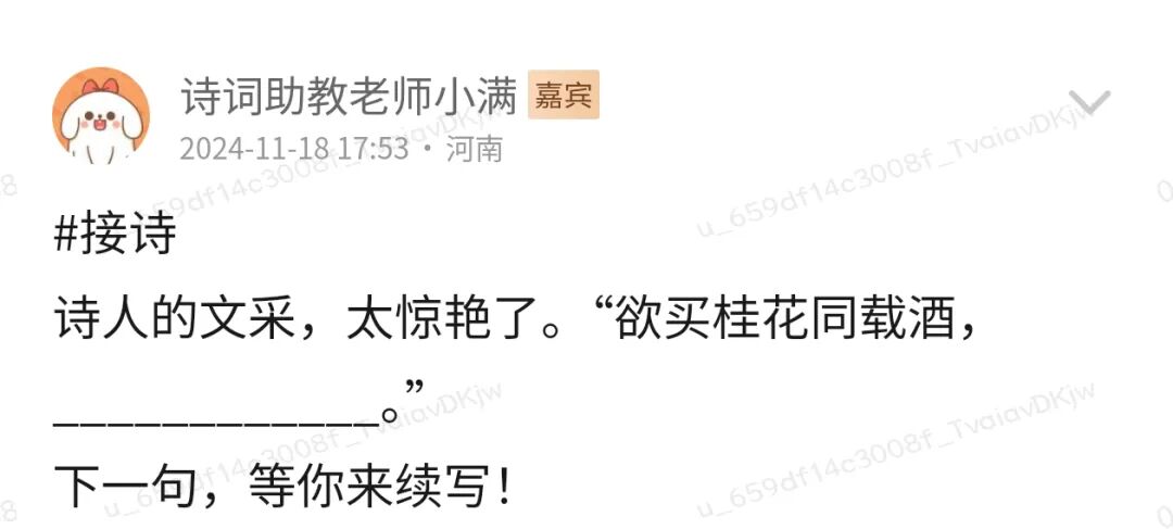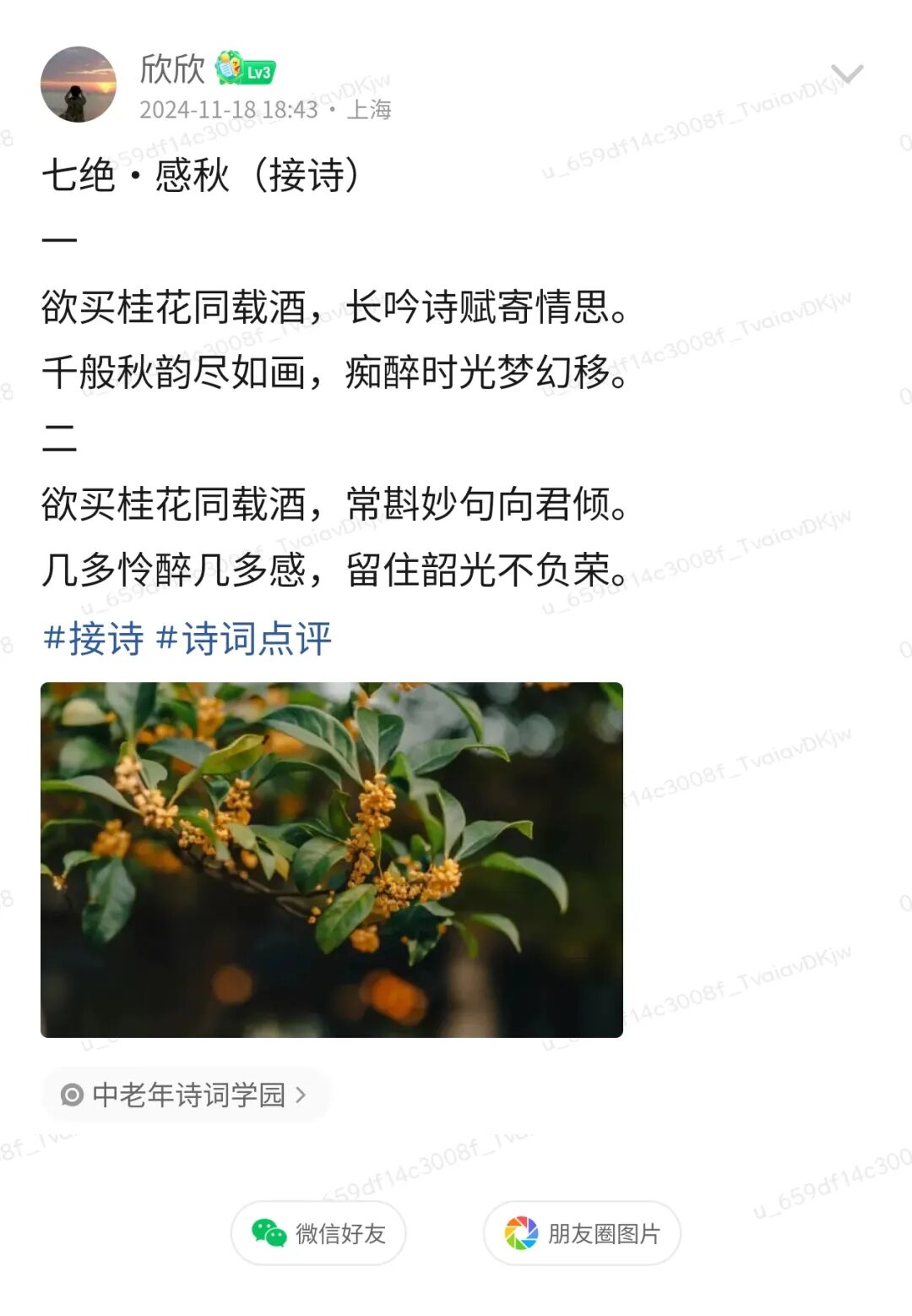 “语尽意未休,断句续佳篇。”接诗活动为“诗词天地会员圈”特有活动,诗友们以独特的视角展现诗词之美,将自己所学所知都展现出来。