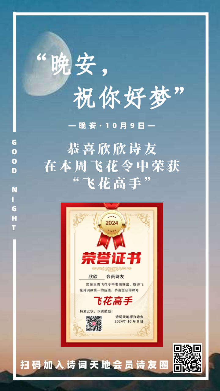 晚安海报丨恭喜欣欣诗友,在本周飞花令中荣获“飞花高手”称号