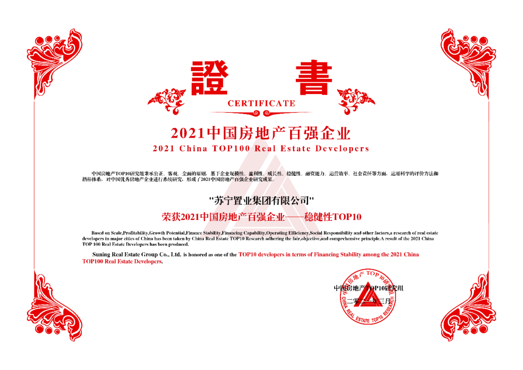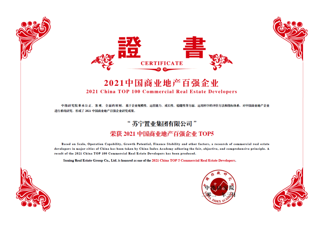 3月18日,由中国企业评价协会、清华大学房地产研究所、中指研究院主办,中国房地产TOP10研究组、中指控股(CIH)承办的“2021中国房地产百强企业研究成果发布会”在北京举行。苏宁置业连续五年蝉联中国房地产50强企业、中国商业地产5强企业,同时位列中国房地产百强企业——稳健性TOP10(第7位)、中国商业地产运营十强企业(第五位),充分体现智慧地产的发展韧性和活力。