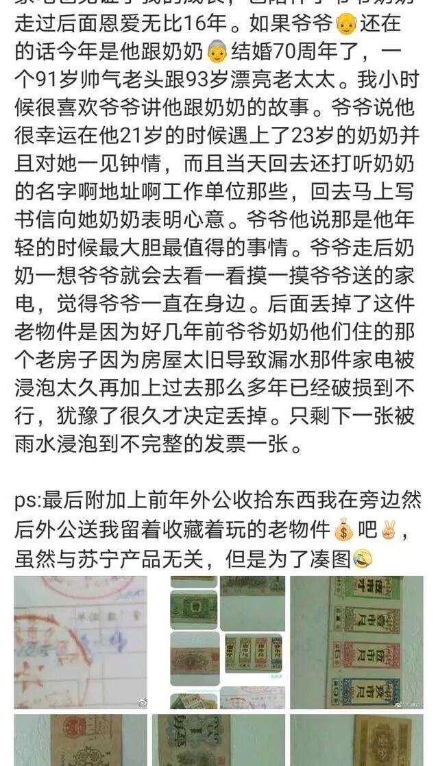 这件家电不仅见证了孙女的成长,也陪伴了爷爷奶奶走过后面恩爱无比的16年。孙女小时候很喜欢爷爷讲他跟奶奶的故事,爷爷说他在他21岁的时候遇上了23岁的奶奶,并且对她一见钟情,当天回去便打听奶奶的情况,并大胆写书信向奶奶表明心意。