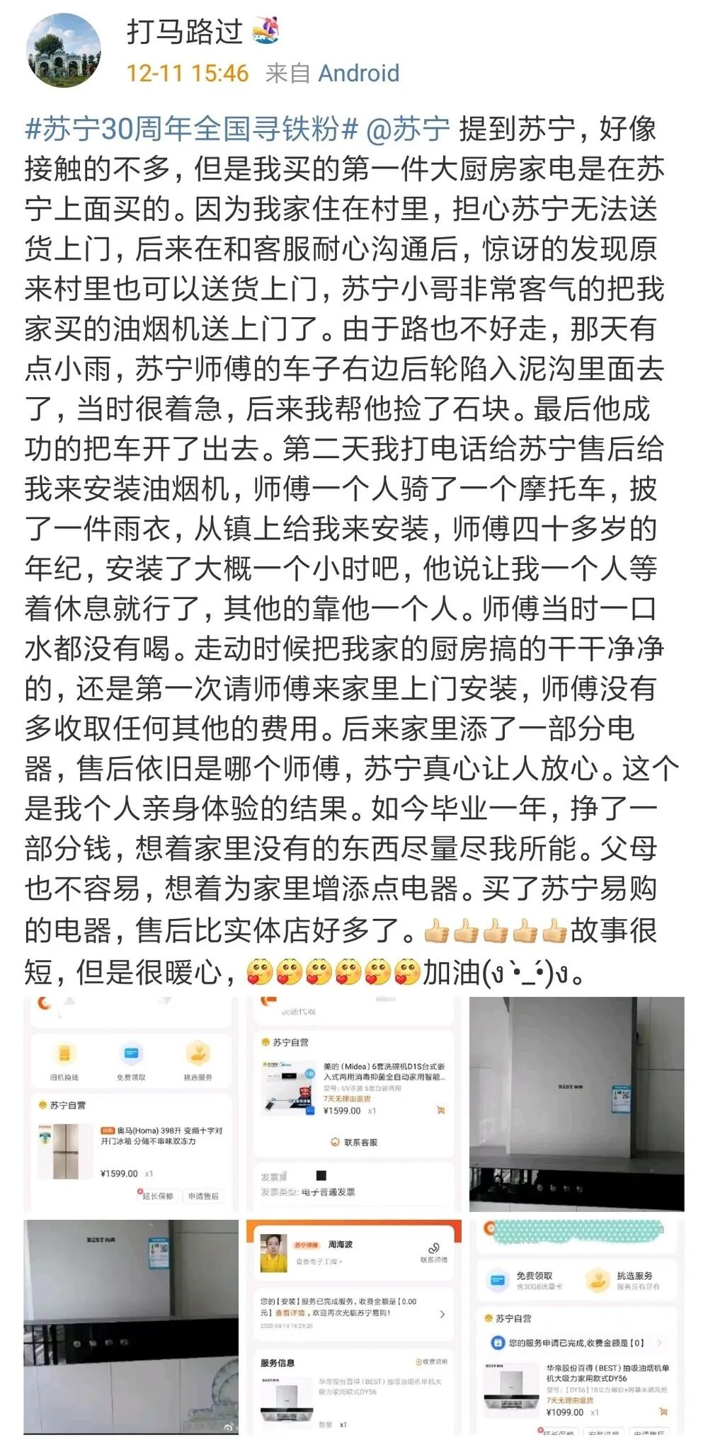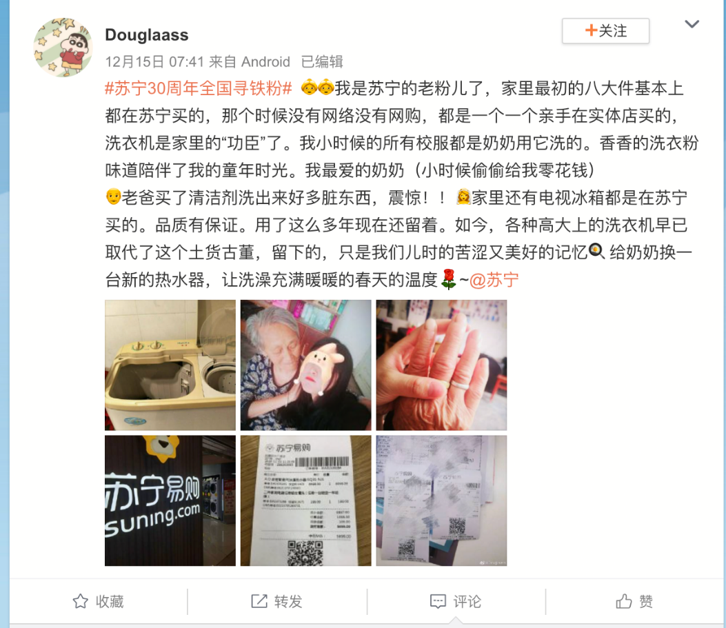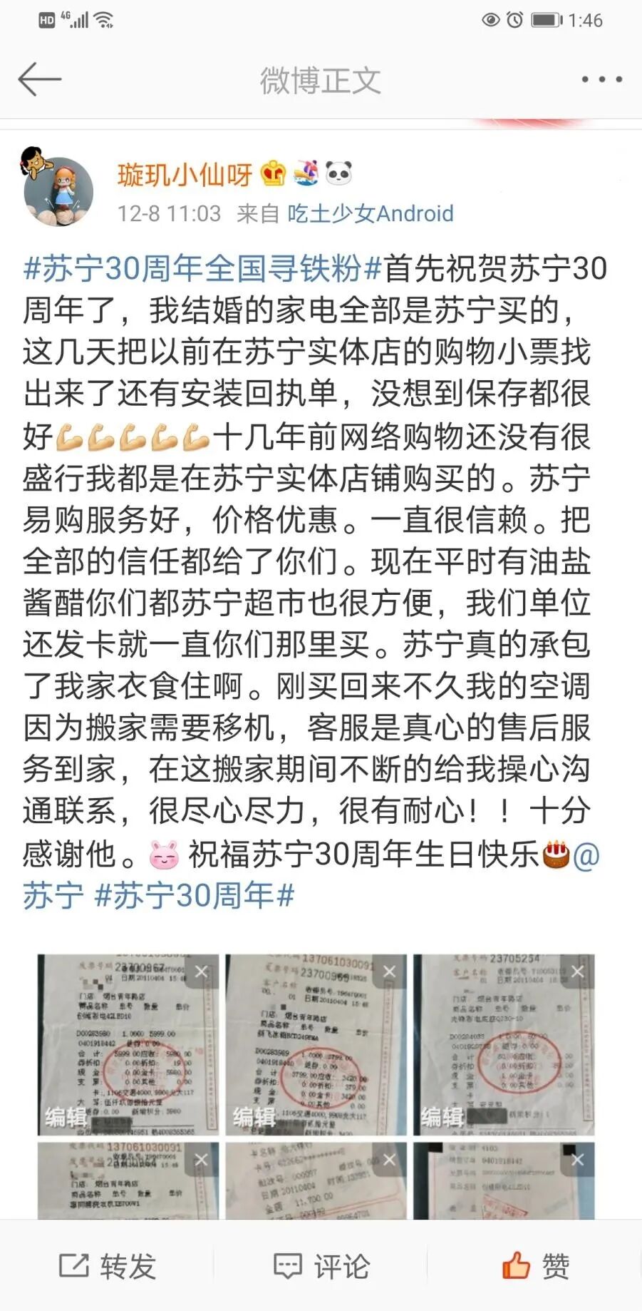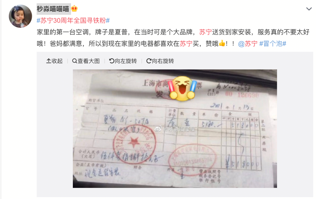 这是在2000年3月5日,爷爷为庆祝和奶奶结婚50周年纪念日,同时也为庆祝孙女的出生,在苏宁为家庭添了第一件大家电。
