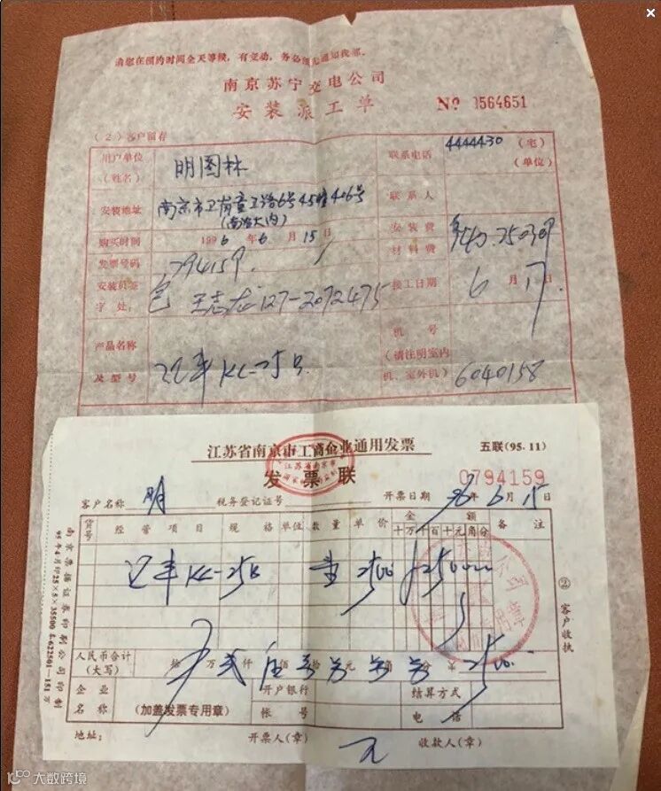 这是来自易购总裁办同事明同辉的老物件,他写道:“作为一名南京老市民,家里于96年于苏宁购入一台空调,这台空调陪伴了我整个童年,给我和家人留下很多无可替代的回忆。近期整理家中物品时发现了当年的发票及送装卡,这是苏宁当年服务的见证,而我如今也成为了一名1200,也即将陪伴苏宁跨过30而立的门槛。我在苏宁享受过优质的服务,如今也在将这份服务理念传承下去。”