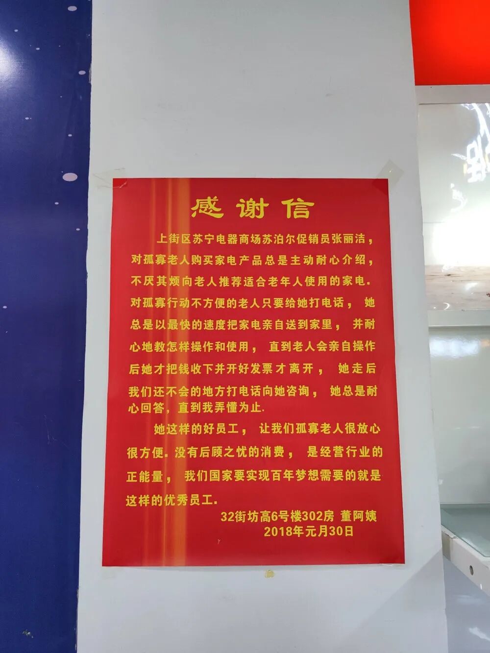 在后台,我们收到了很多顾客给的感谢信,他们来自全国各个地区,看到这些,我们热泪盈眶,作为一名消费者,我知道当店员帮我解决多大的困难的时候我才会给写一封感谢信,作为一名员工,我也知道能获得一封感谢信有多难,而当我了解了我们一线的员工是如何热情的迎接顾客,不厌其烦地为顾客解决疑难的时候,我才知道,一线的苏宁人有多么的可爱!各位奋战在一线的苏宁人,向你们致敬!
