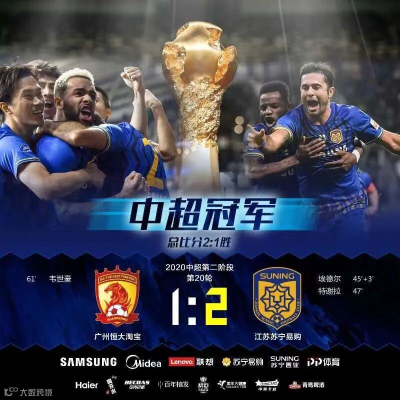 11月12日,2020中超联赛决赛第二回合在苏州决出胜负。江苏苏宁易购队凭借埃德尔、特谢拉的进球,以2:1战胜广州恒大队,夺得队史首个国内顶级联赛冠军。