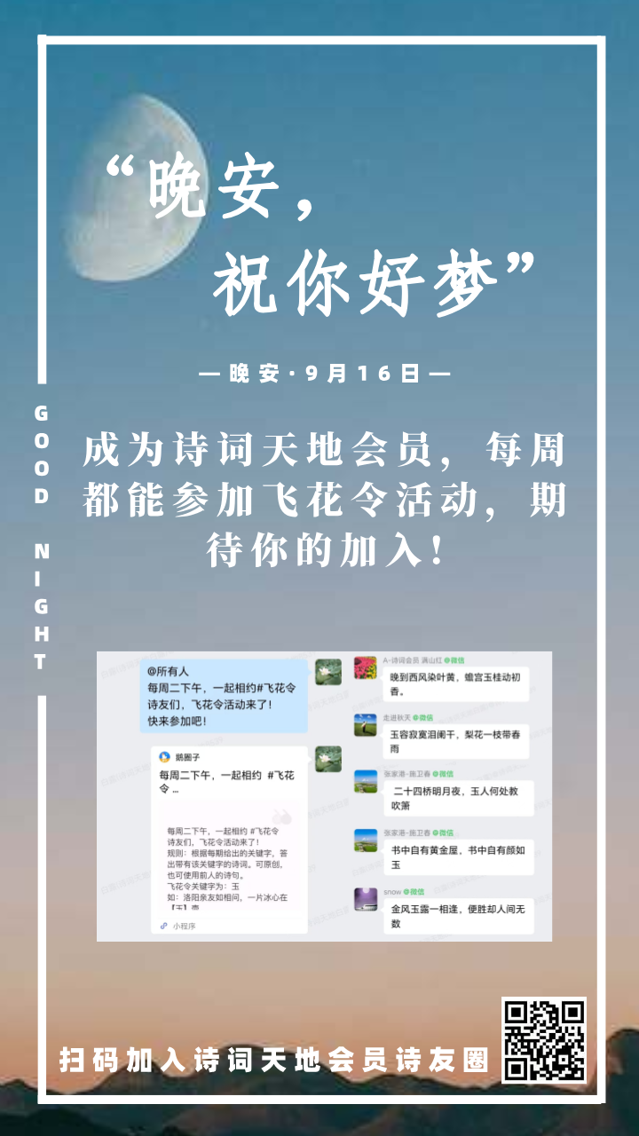 晚安海报丨成为诗词天地会员,每周都能参加飞花令活动,期待你的加入!