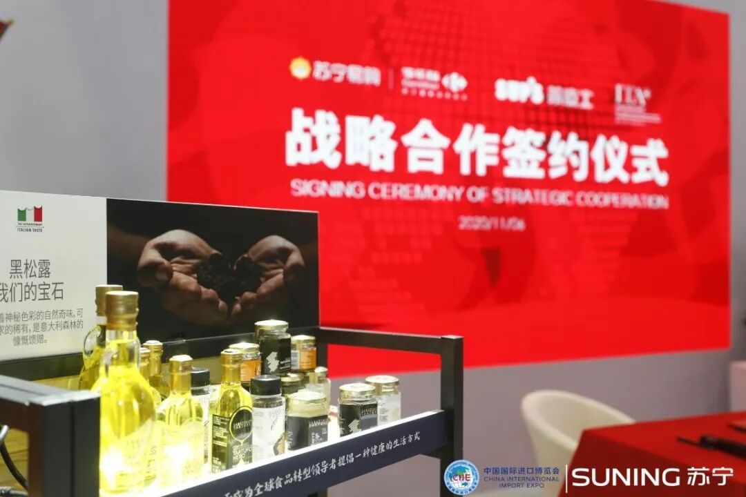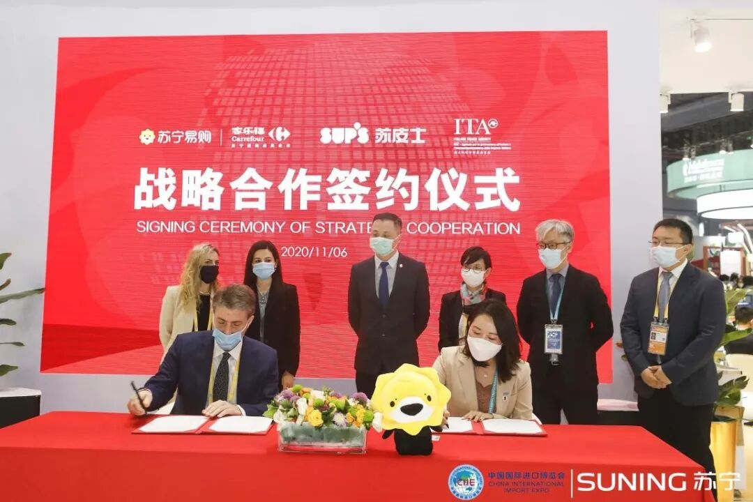 第三届进博会现场,苏宁再次以“参展方+采购方”的双重身份亮相,与意大利对外贸易委员会(ITA)再续前缘加深合作,苏宁国际、苏宁家乐福分别与ITA现场签约,围绕品牌引入、供应链打造、消费升级等多个角度达成深层战略共识,计划打造面向国内消费者的海外正品商品线上推广平台,持续为消费者引进意大利品质好物。