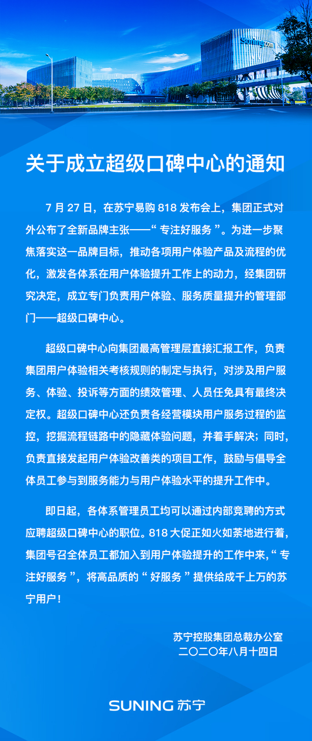 8月14日,苏宁易购超级口碑中心成立。该部门专门负责用户体验、服务质量提升,并直接向集团最高管理层汇报。