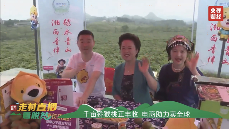 在央视的直播镜头里,上千亩的猕猴桃基地向大山深处绵延而去,跟远处的山、云和雾气交融,十八洞村的猕猴桃基地绿意盎然,果实缀满枝头,穿着苗族服装的当地村民正在基地忙活。基地旁边的直播间,湘西州副州长向清平、湖南苏宁易购总经理窦祝平和当地网红二丫共同现身直播间,助推十八洞猕猴桃外销。