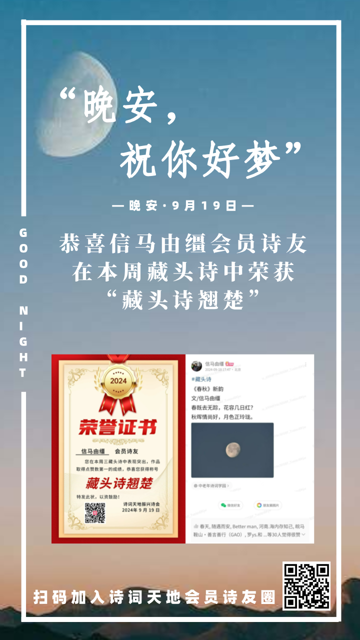 晚安海报丨恭喜信马由缰会员诗友,在本周藏头诗中荣获“藏头诗翘楚”!